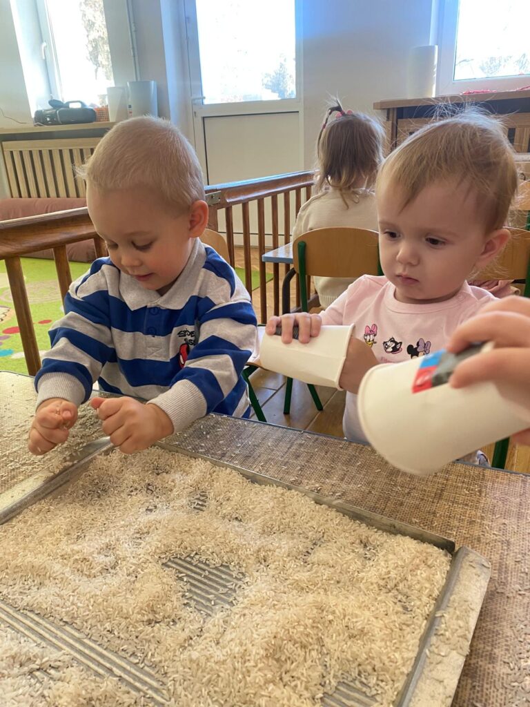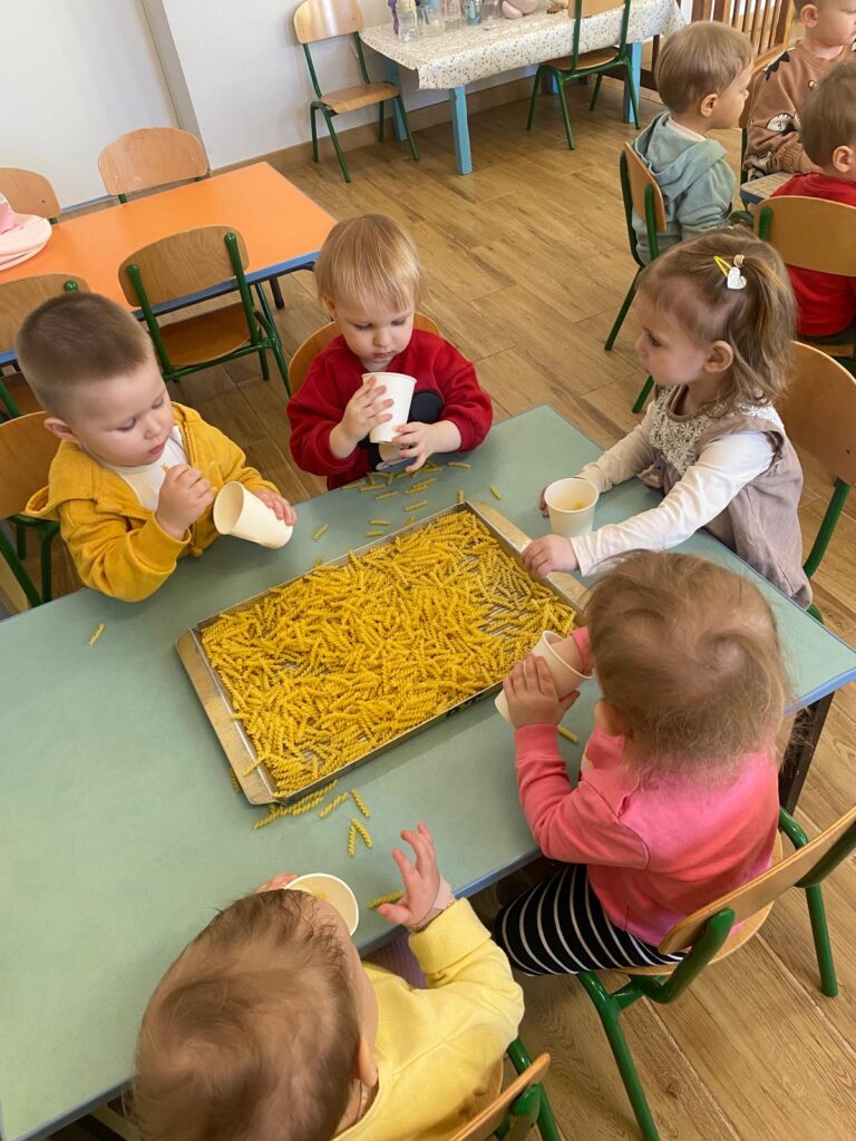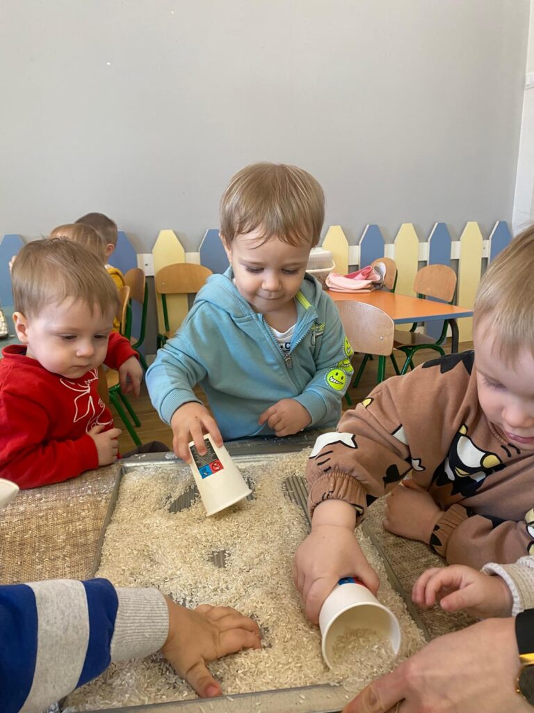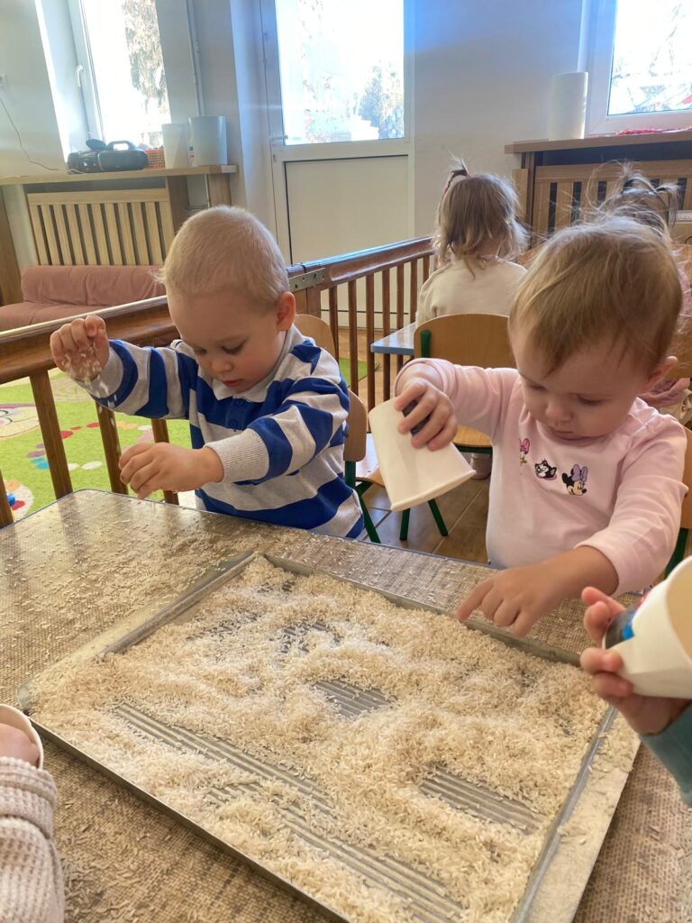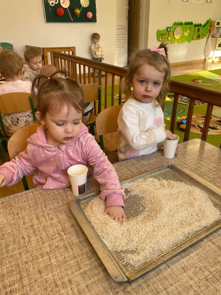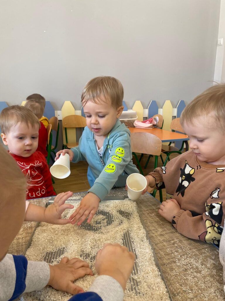 Ten tydzień był bardzo ciekawy. Mieliśmy zabawy rozwijające w sposób zintegrowany nasze zmysły wzroku, dotyku i słuchu. Rysowaliśmy palcem w ryżu, nasypywaliśmy do kubeczków makaron i fasolę (ćwiczenia chwytu precyzyjnego). Rozwijaliśmy zmysł równowagi na piłkach sensorycznych i lepiliśmy babki i kule z piasku kinetycznego.