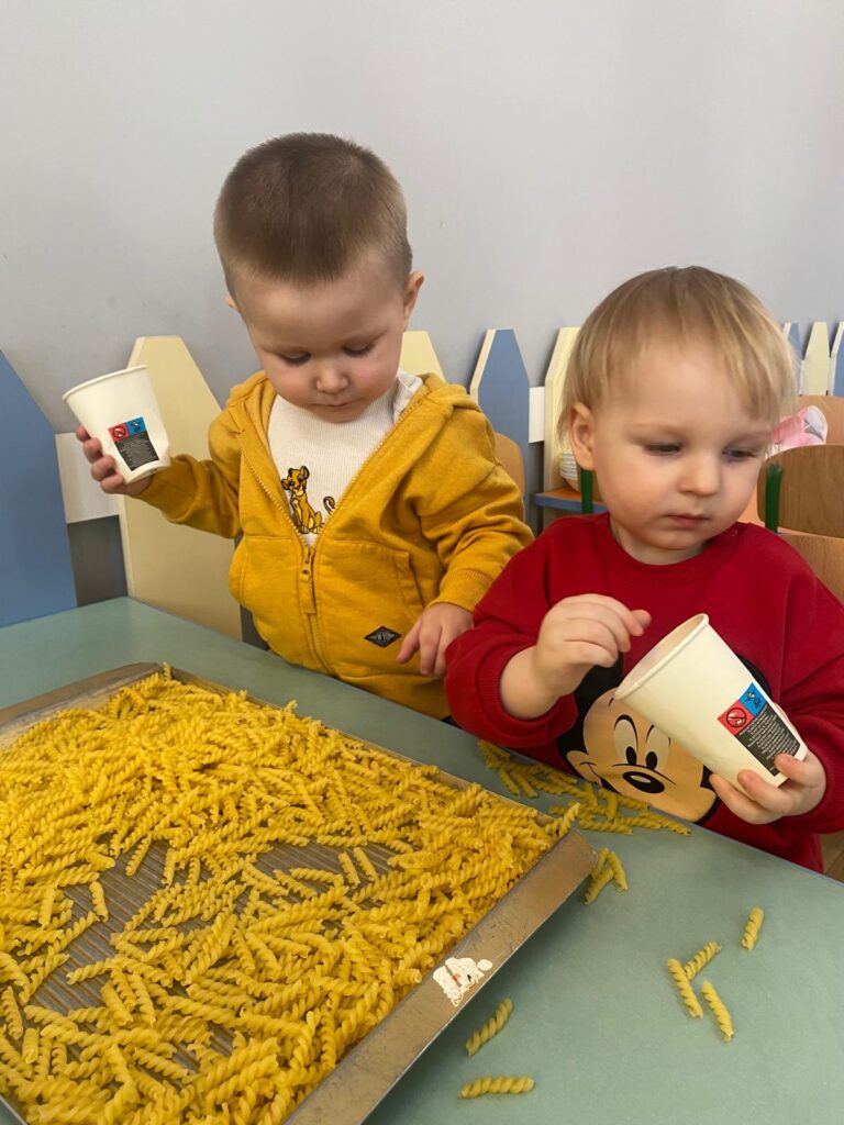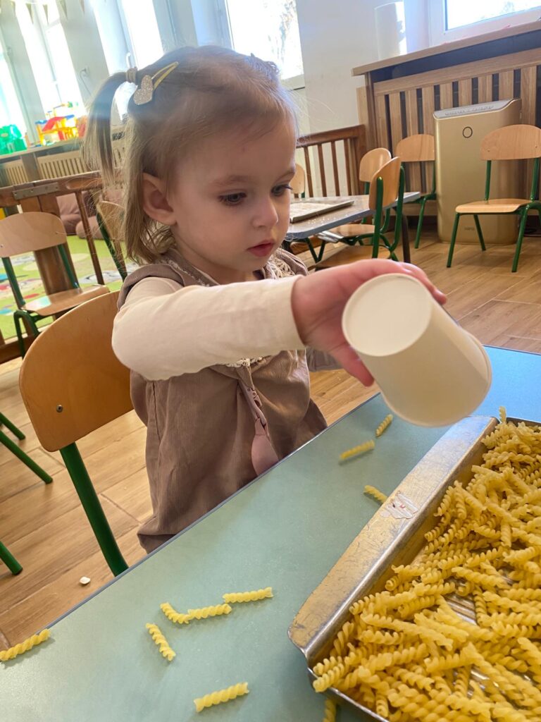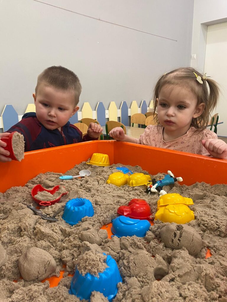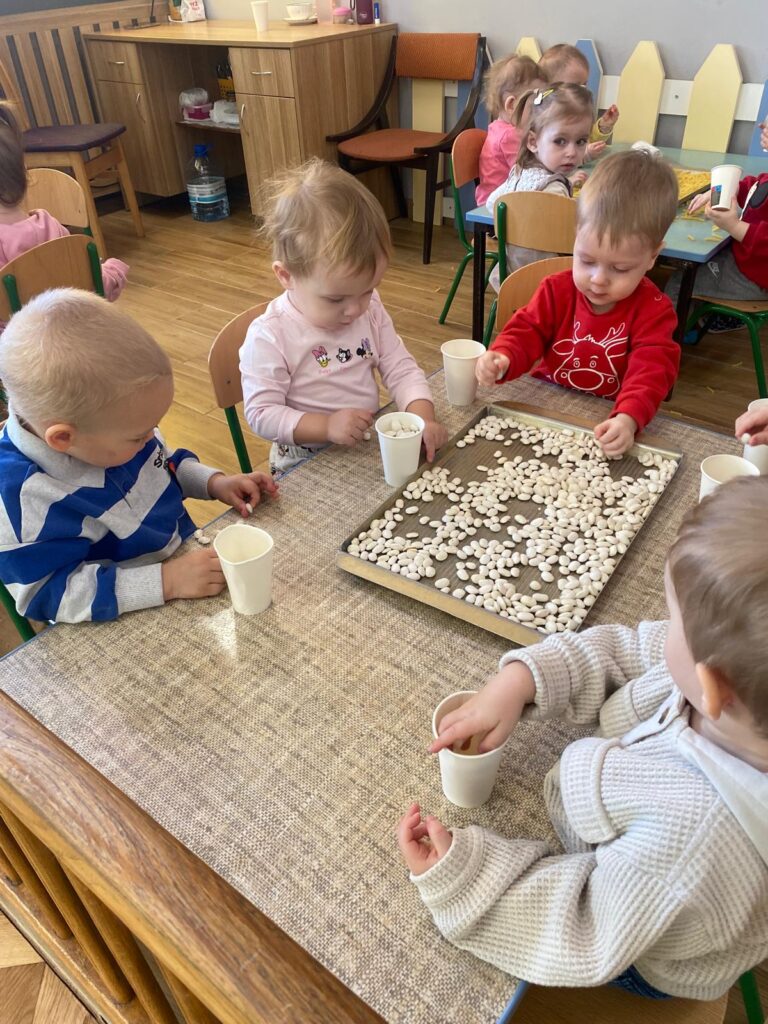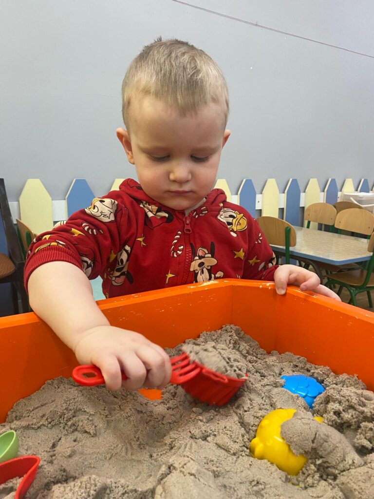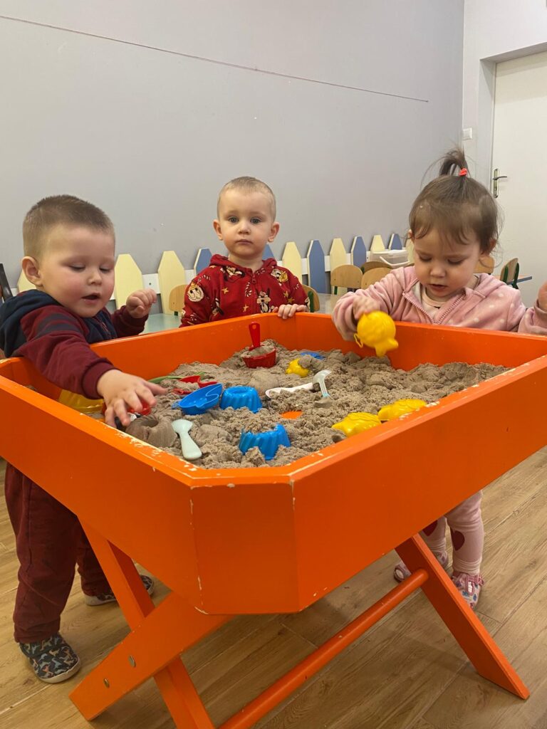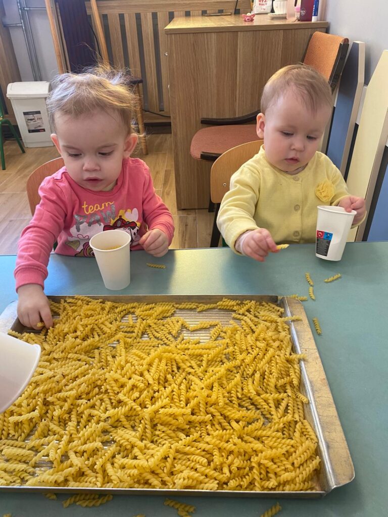 Ten tydzień był bardzo ciekawy. Mieliśmy zabawy rozwijające w sposób zintegrowany nasze zmysły wzroku, dotyku i słuchu. Rysowaliśmy palcem w ryżu, nasypywaliśmy do kubeczków makaron i fasolę (ćwiczenia chwytu precyzyjnego). Rozwijaliśmy zmysł równowagi na piłkach sensorycznych i lepiliśmy babki i kule z piasku kinetycznego.