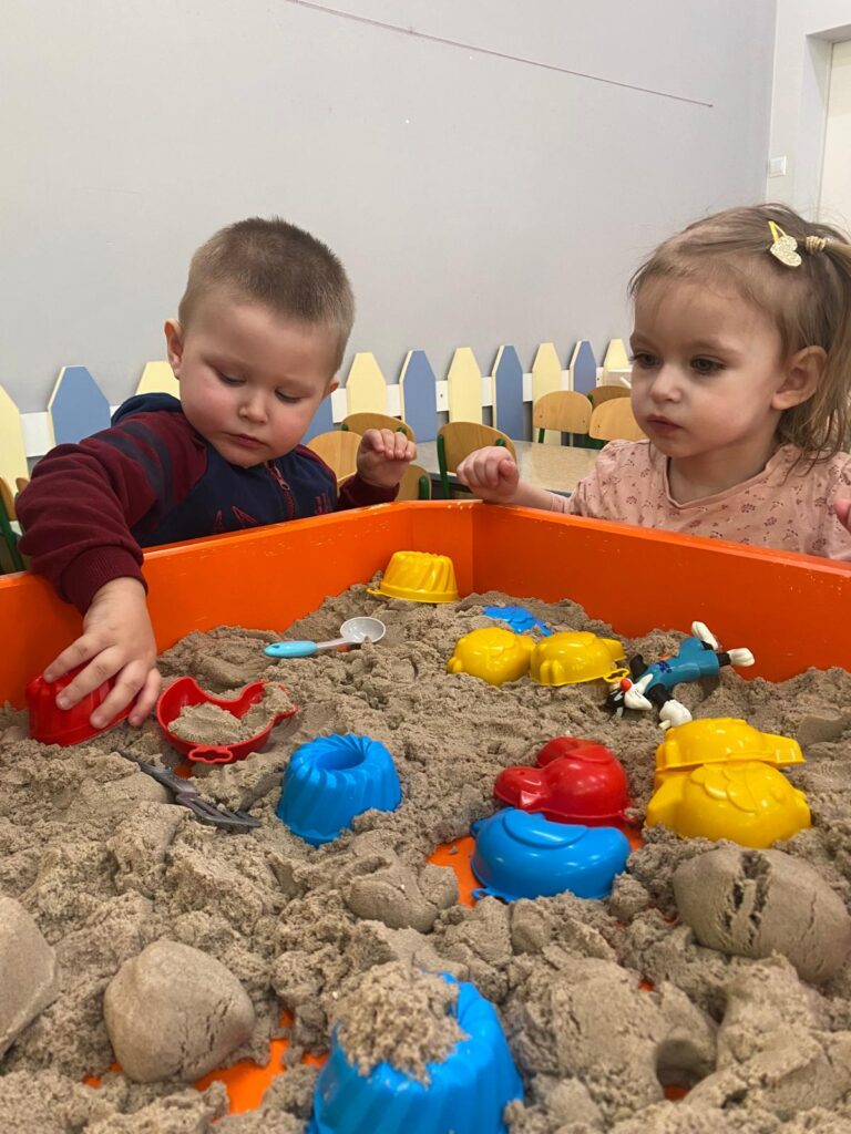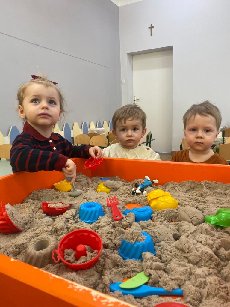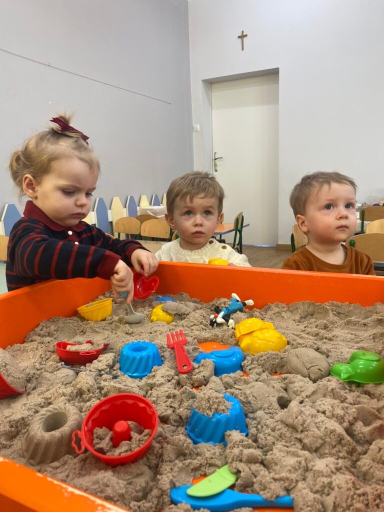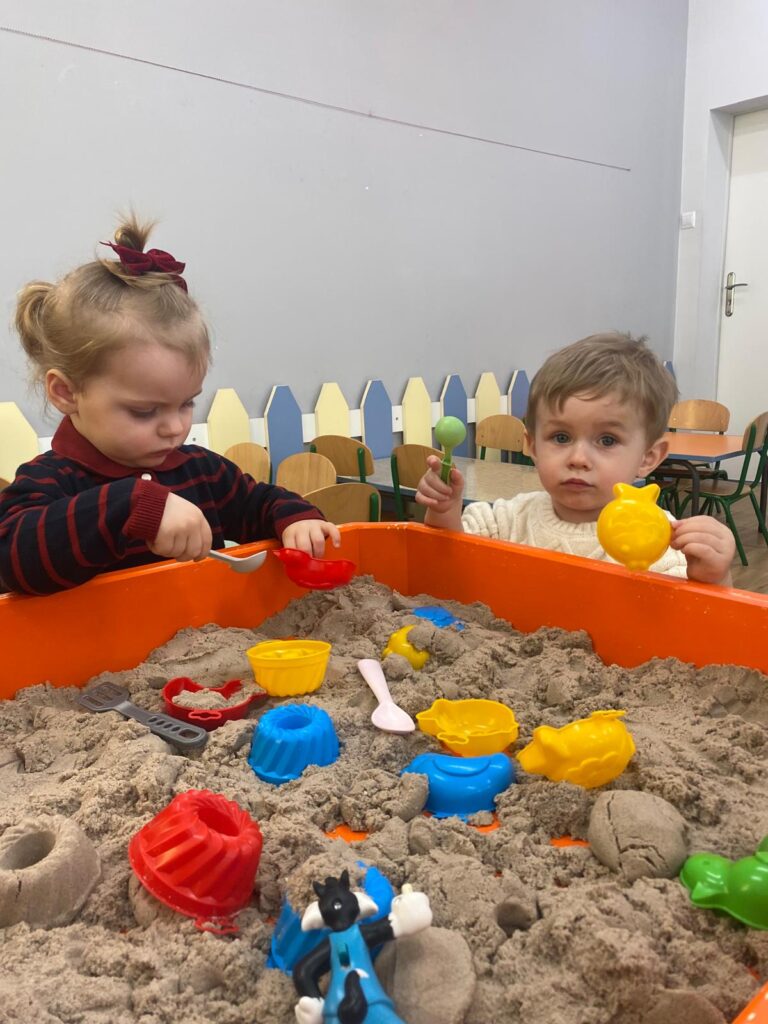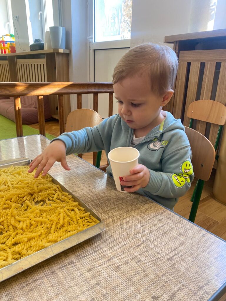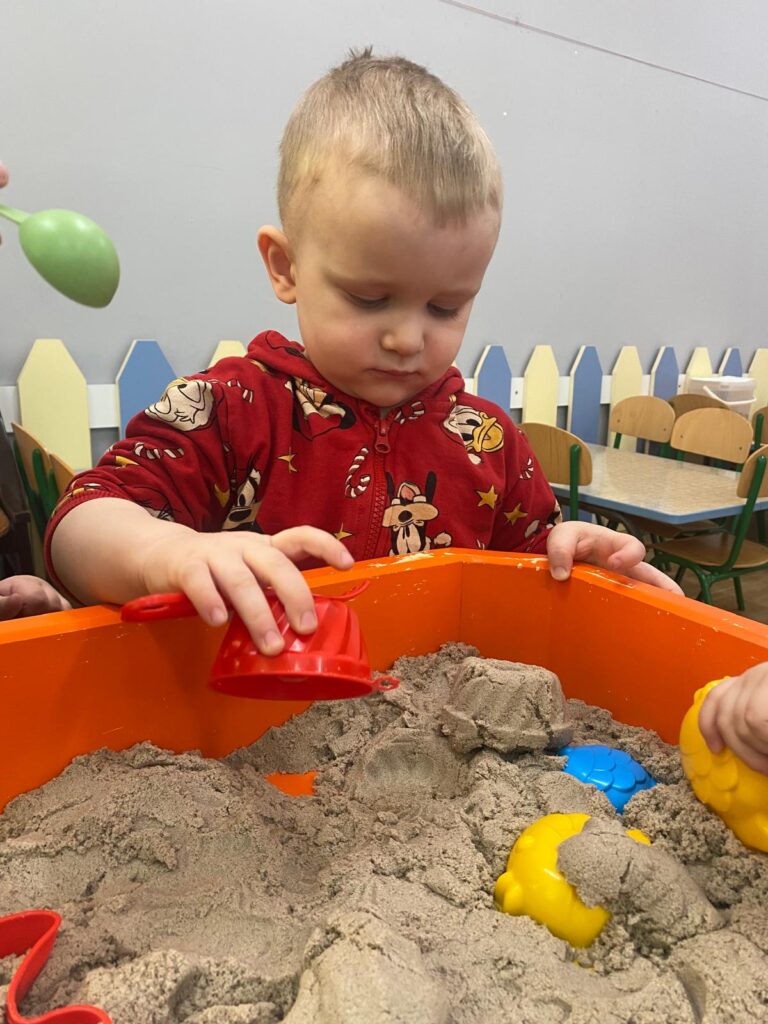 Ten tydzień był bardzo ciekawy. Mieliśmy zabawy rozwijające w sposób zintegrowany nasze zmysły wzroku, dotyku i słuchu. Rysowaliśmy palcem w ryżu, nasypywaliśmy do kubeczków makaron i fasolę (ćwiczenia chwytu precyzyjnego). Rozwijaliśmy zmysł równowagi na piłkach sensorycznych i lepiliśmy babki i kule z piasku kinetycznego.