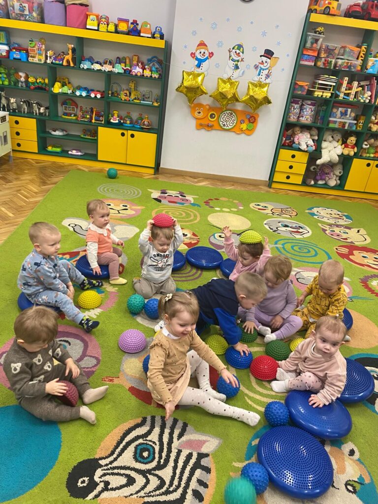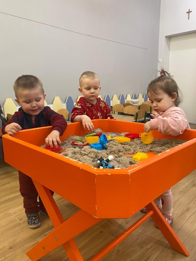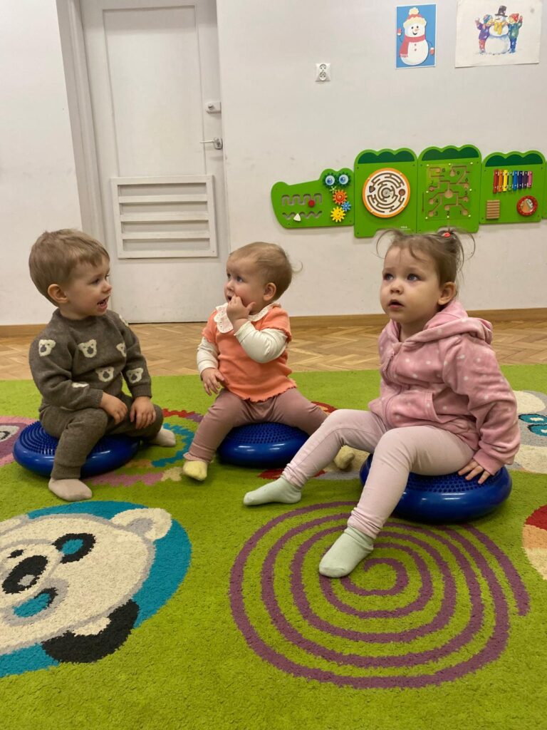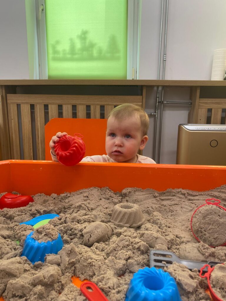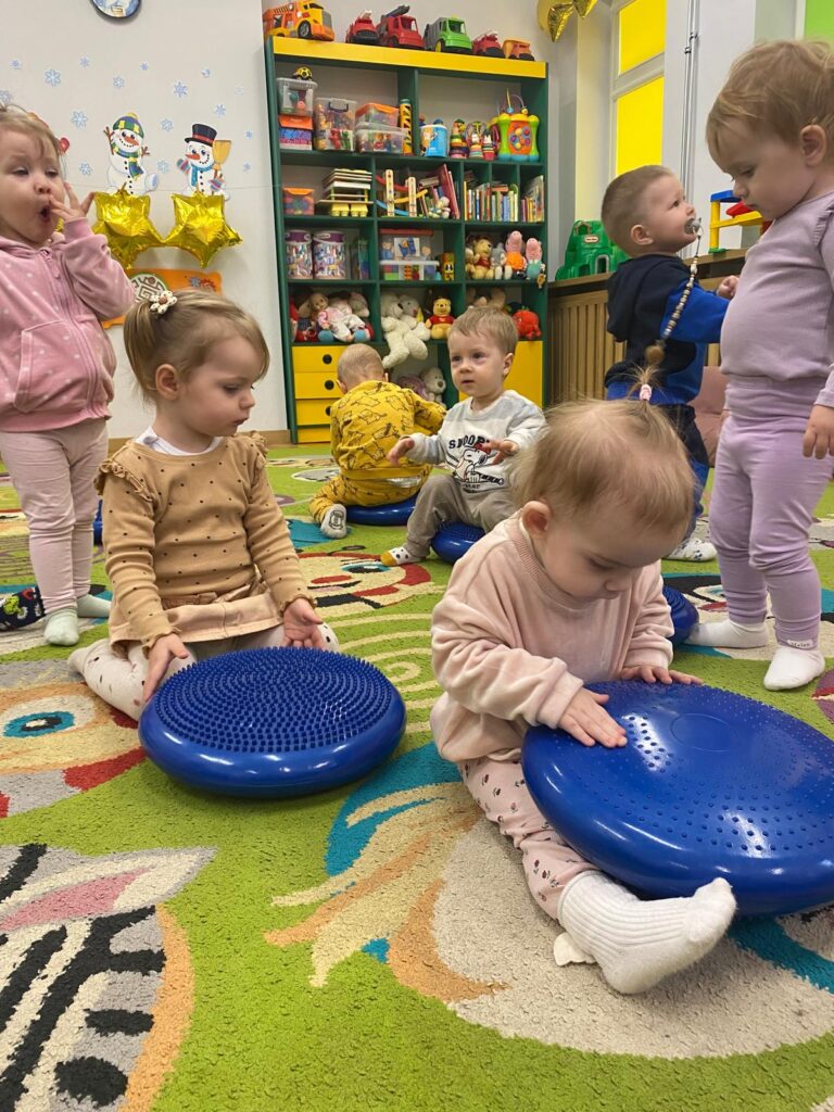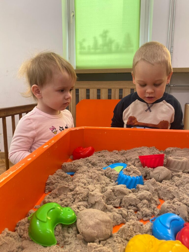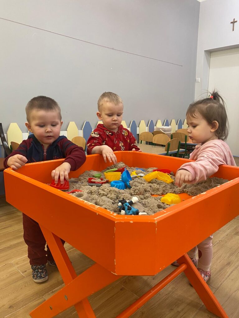 Ten tydzień był bardzo ciekawy. Mieliśmy zabawy rozwijające w sposób zintegrowany nasze zmysły wzroku, dotyku i słuchu. Rysowaliśmy palcem w ryżu, nasypywaliśmy do kubeczków makaron i fasolę (ćwiczenia chwytu precyzyjnego). Rozwijaliśmy zmysł równowagi na piłkach sensorycznych i lepiliśmy babki i kule z piasku kinetycznego.