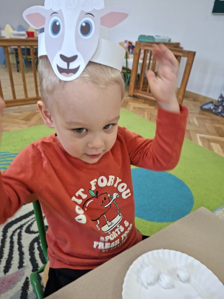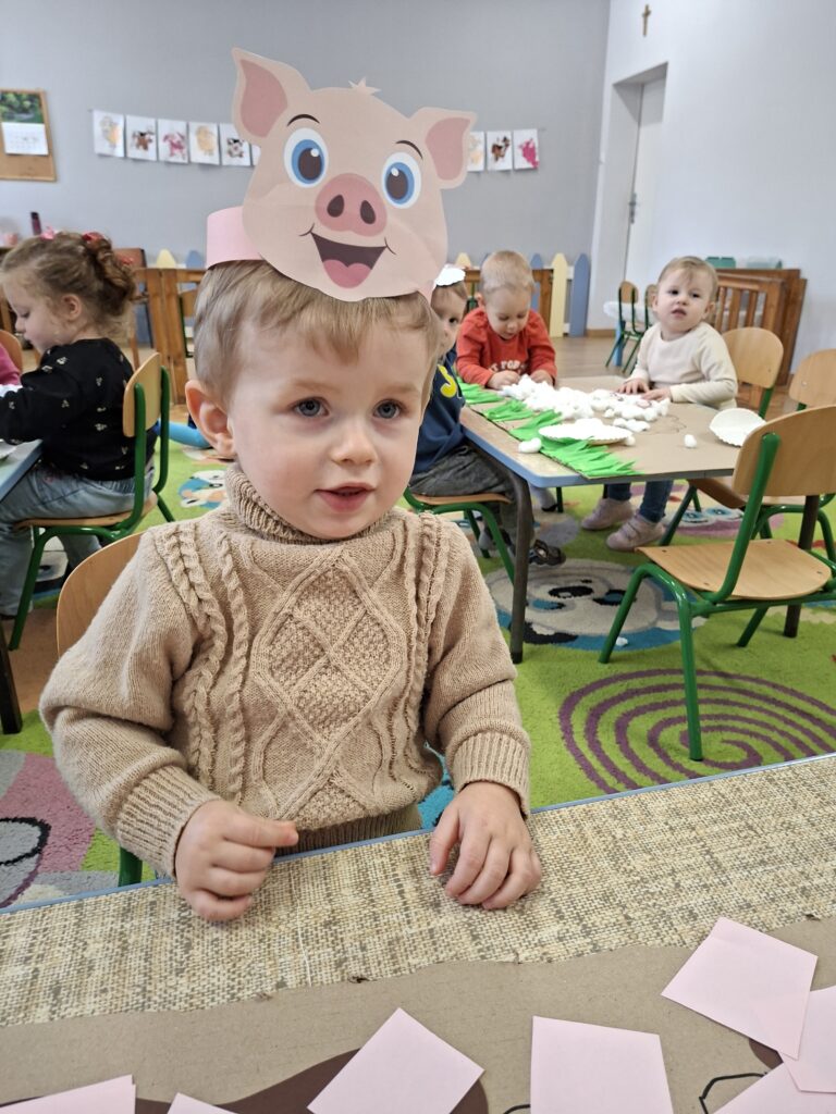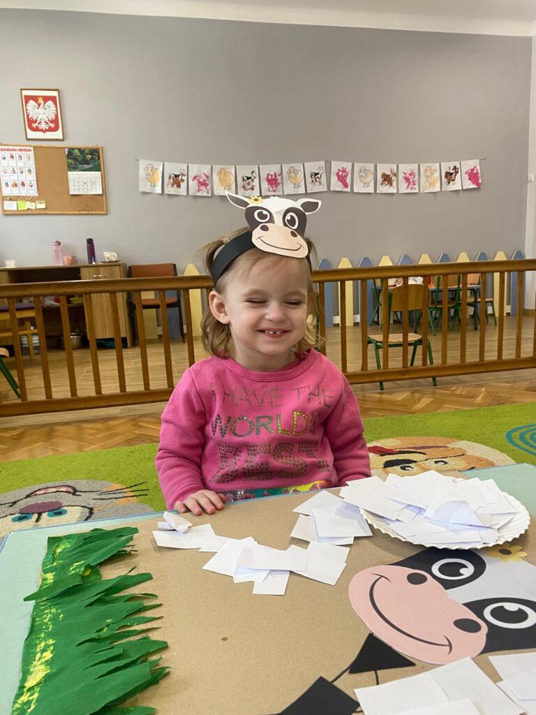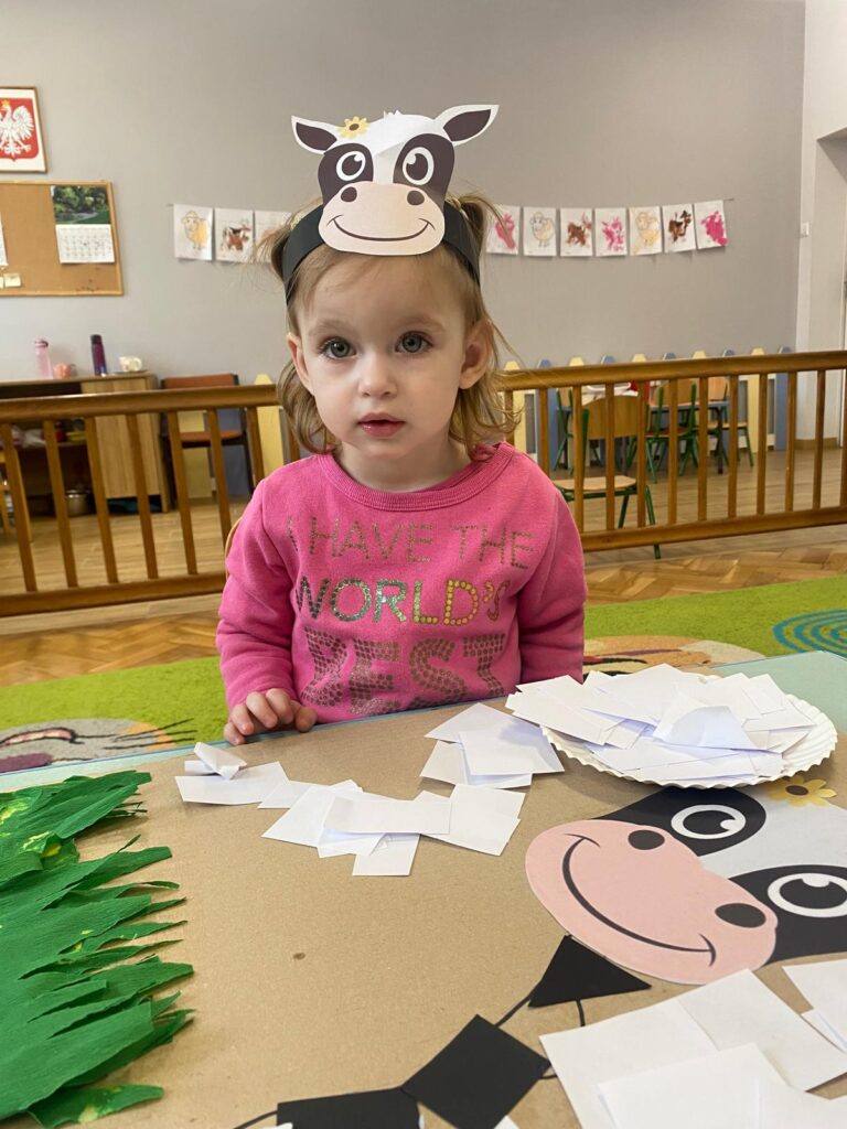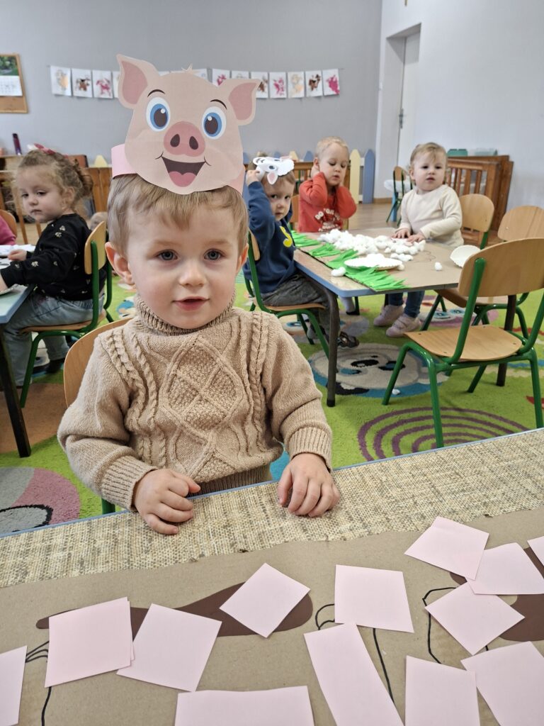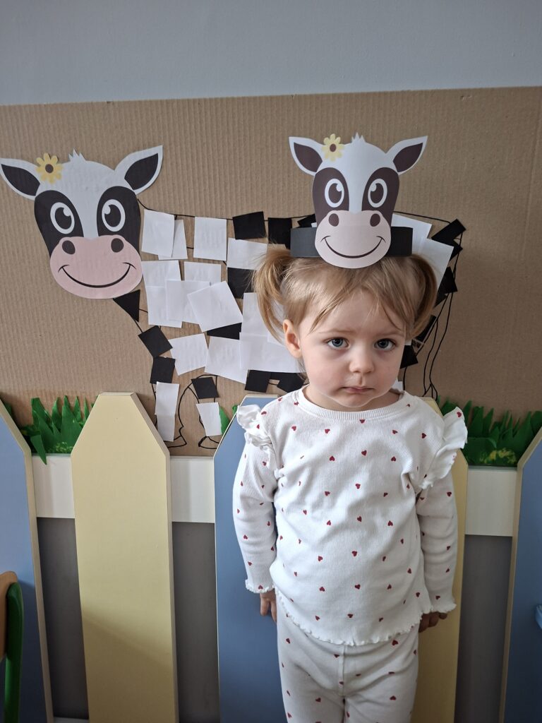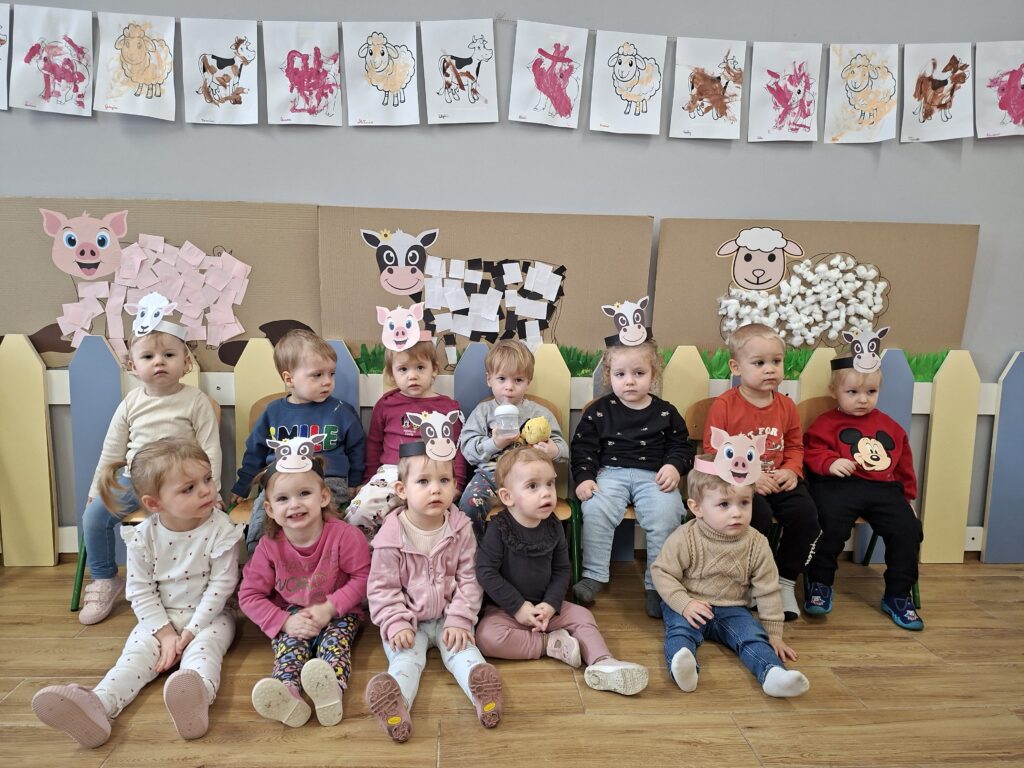 Co się u nas działo?! Odwiedziły nas krówka, owieczka i świnka… Rozmawialiśmy o zwierzętach mieszkających na wsi. Poznaliśmy ich nazwy, wygląd i głosy, które naśladowaliśmy (ćwiczenia do rozwoju mowy). Wykonaliśmy też śliczne prace plastyczne (malowanie farbą i wyklejanki – rozwijaliśmy sprawność manualną naszych rączek ). Te dni dały nam dużo radości i świetnie się bawiliśmy.