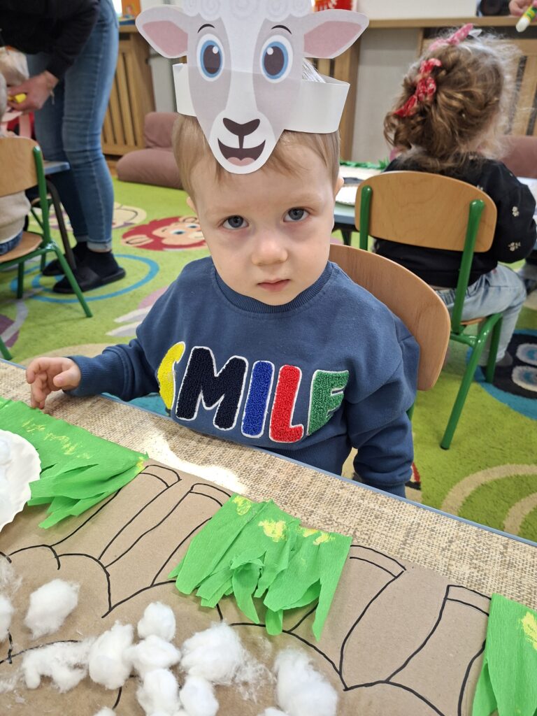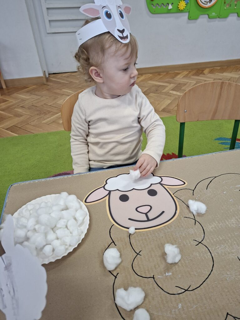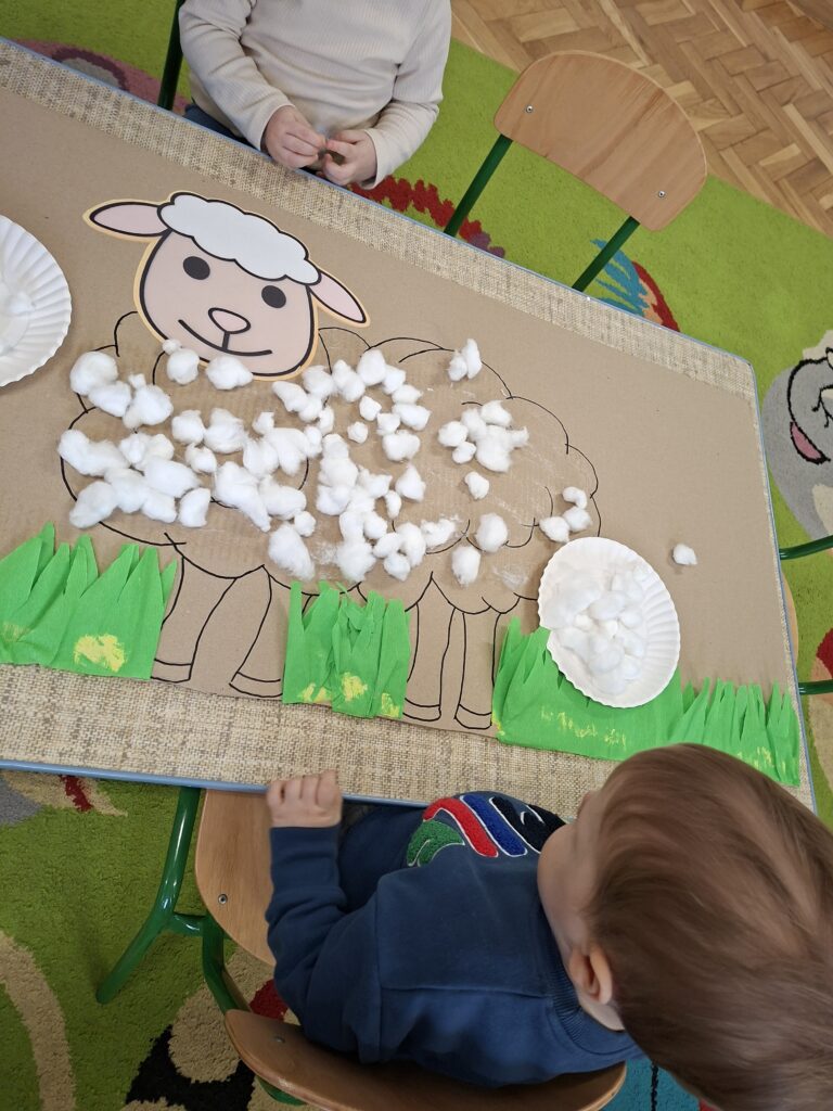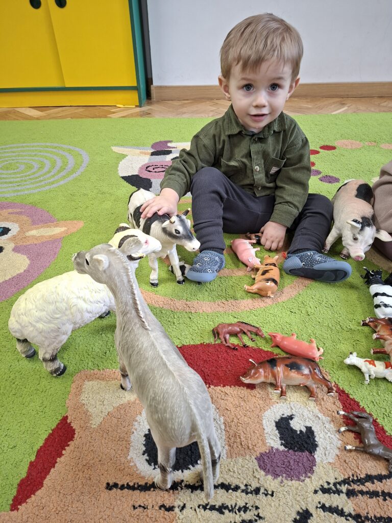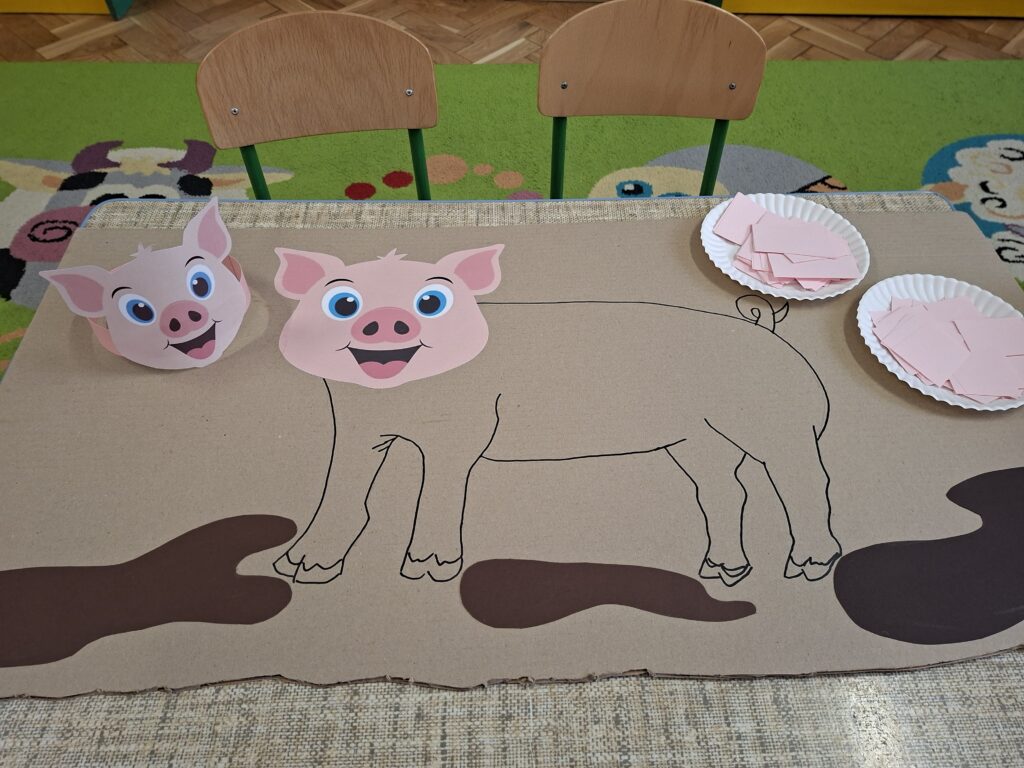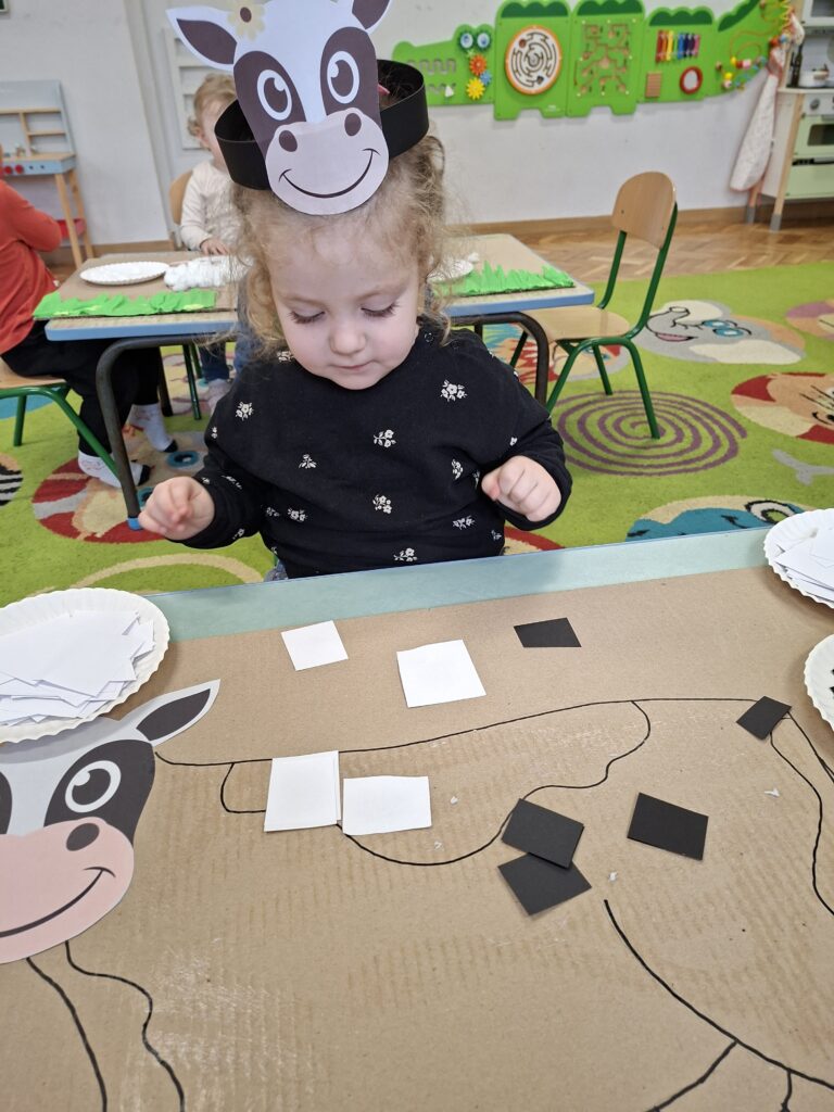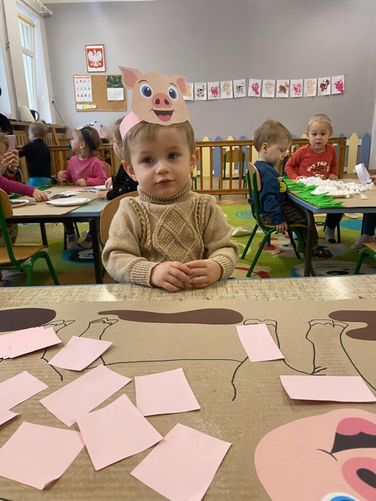 Co się u nas działo?! Odwiedziły nas krówka, owieczka i świnka… Rozmawialiśmy o zwierzętach mieszkających na wsi. Poznaliśmy ich nazwy, wygląd i głosy, które naśladowaliśmy (ćwiczenia do rozwoju mowy). Wykonaliśmy też śliczne prace plastyczne (malowanie farbą i wyklejanki – rozwijaliśmy sprawność manualną naszych rączek ). Te dni dały nam dużo radości i świetnie się bawiliśmy.