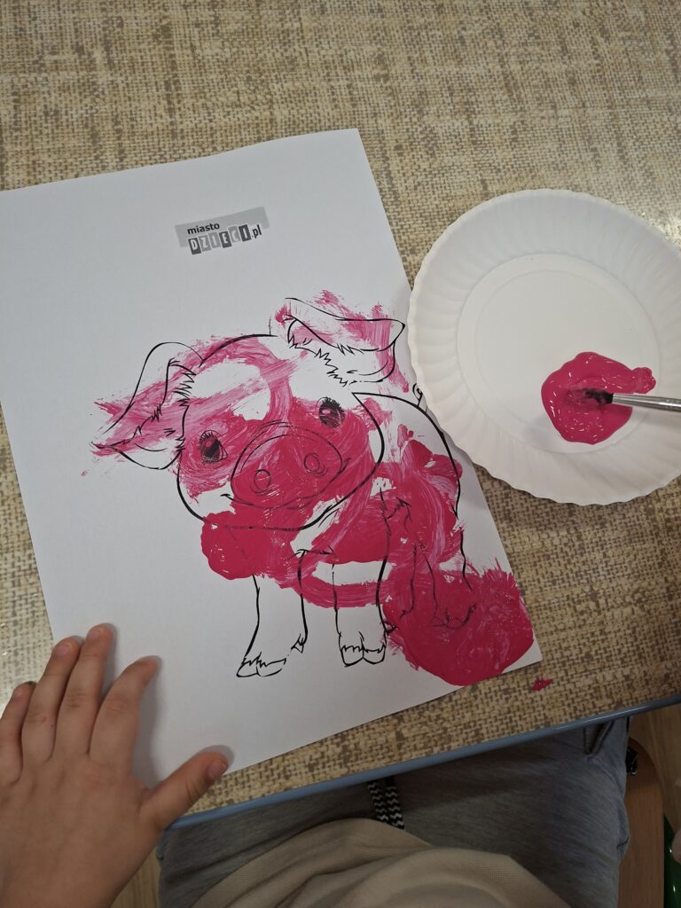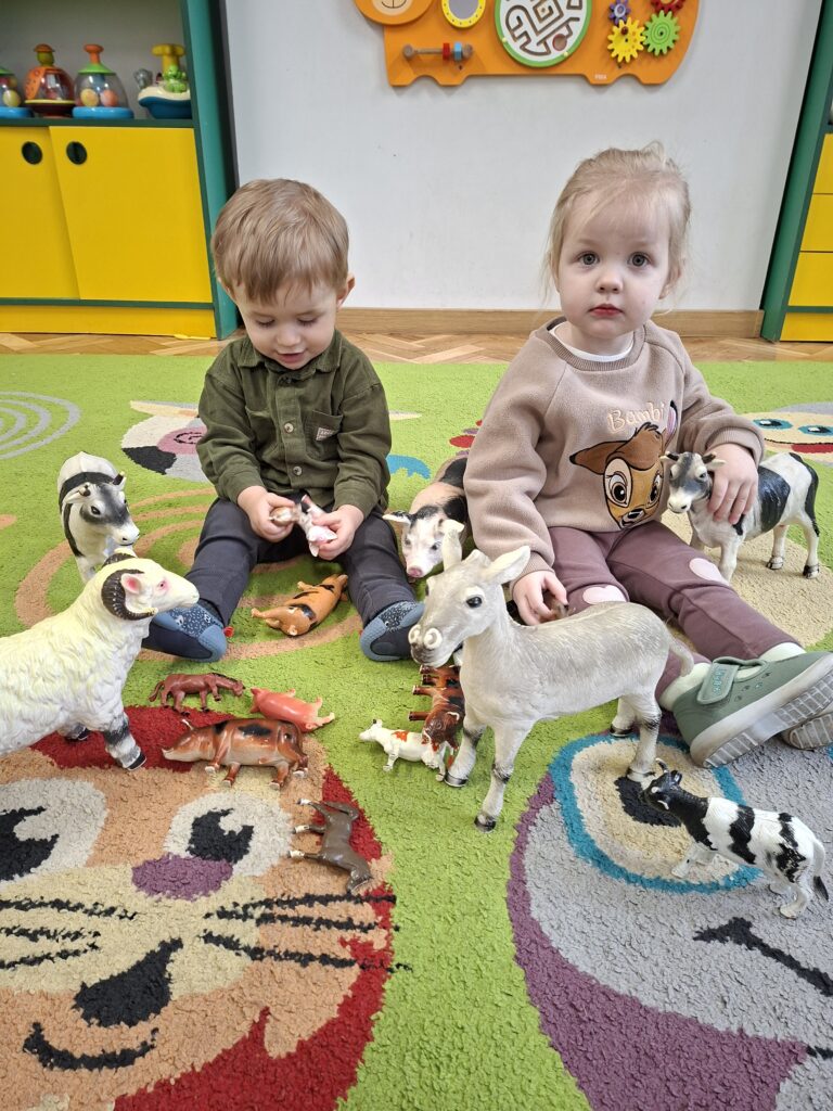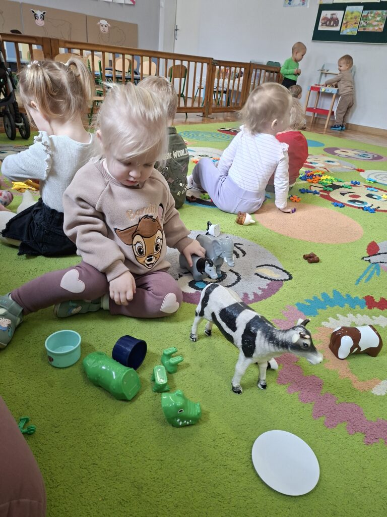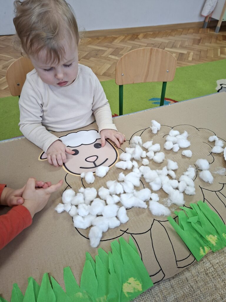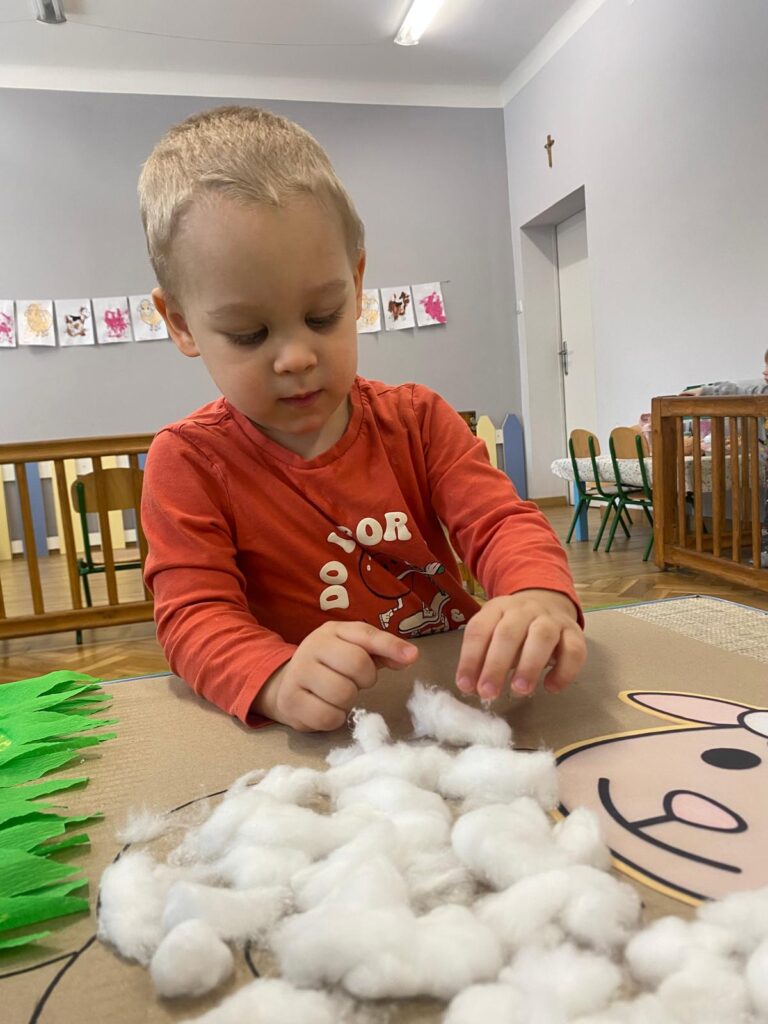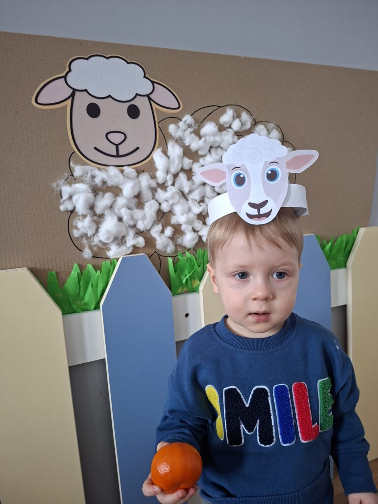 Co się u nas działo?! Odwiedziły nas krówka, owieczka i świnka… Rozmawialiśmy o zwierzętach mieszkających na wsi. Poznaliśmy ich nazwy, wygląd i głosy, które naśladowaliśmy (ćwiczenia do rozwoju mowy). Wykonaliśmy też śliczne prace plastyczne (malowanie farbą i wyklejanki – rozwijaliśmy sprawność manualną naszych rączek ). Te dni dały nam dużo radości i świetnie się bawiliśmy.