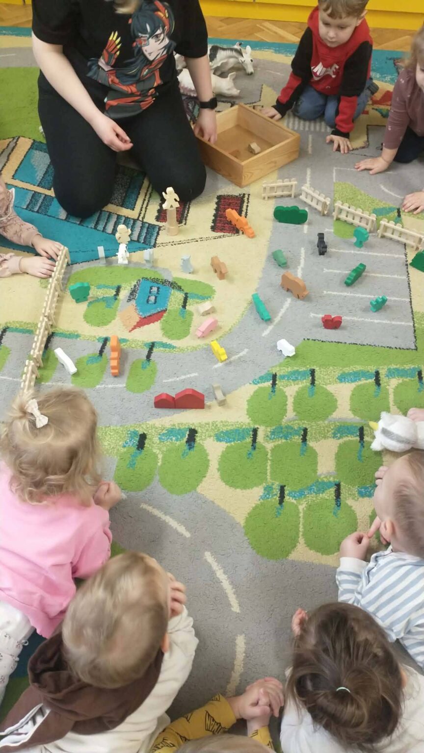 Dziś poznawaliśmy mieszkańców zagrody – ich nazwy, odgłosy i zwyczaje. Wspólnie zbudowaliśmy własną zagrodę i świetnie się przy tym bawiliśmy! 🏗🌾