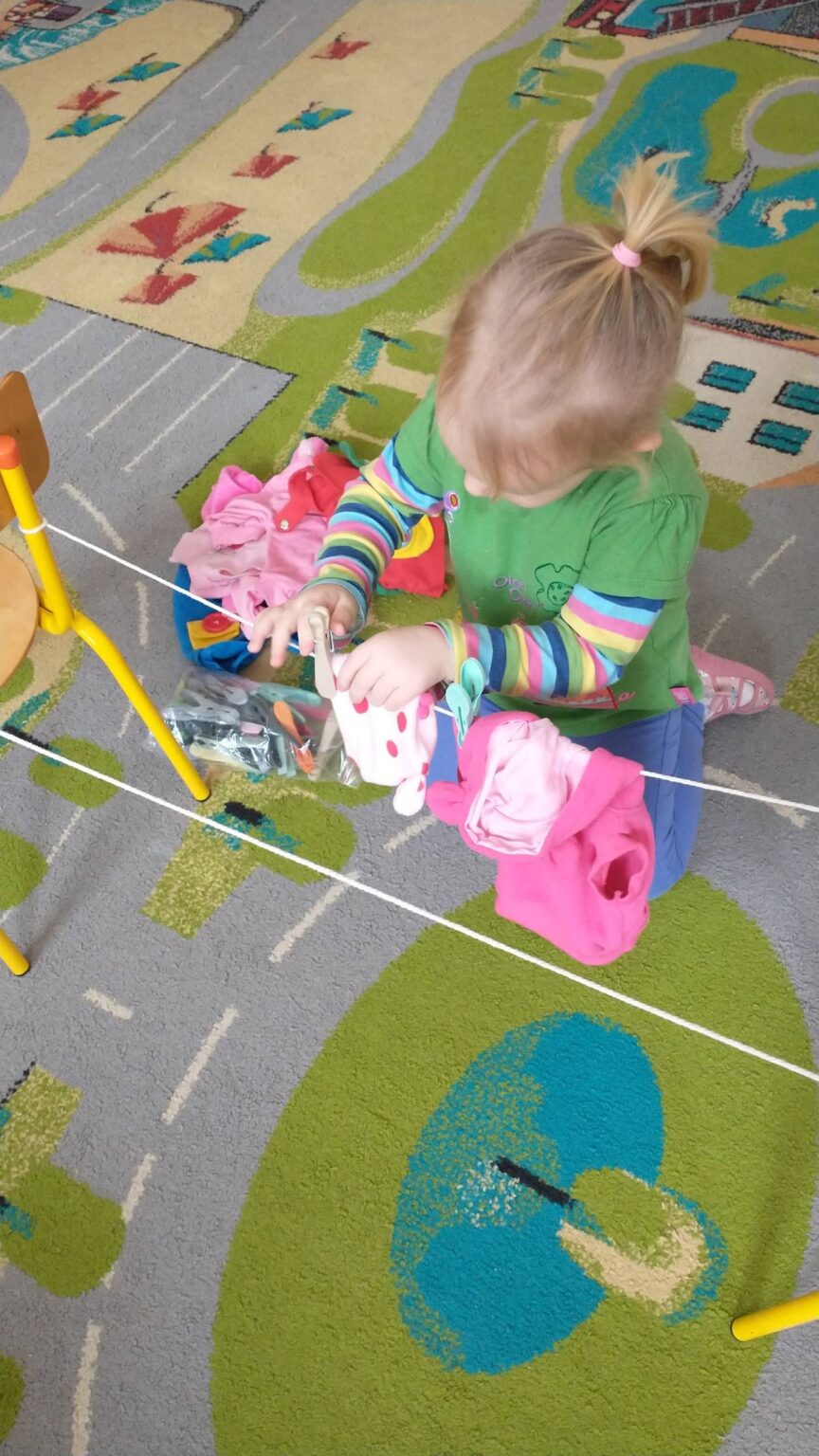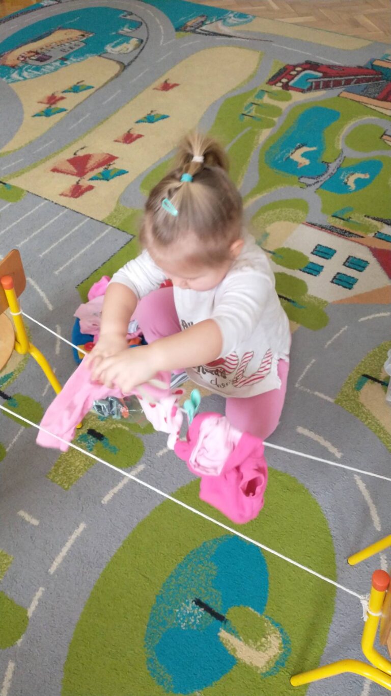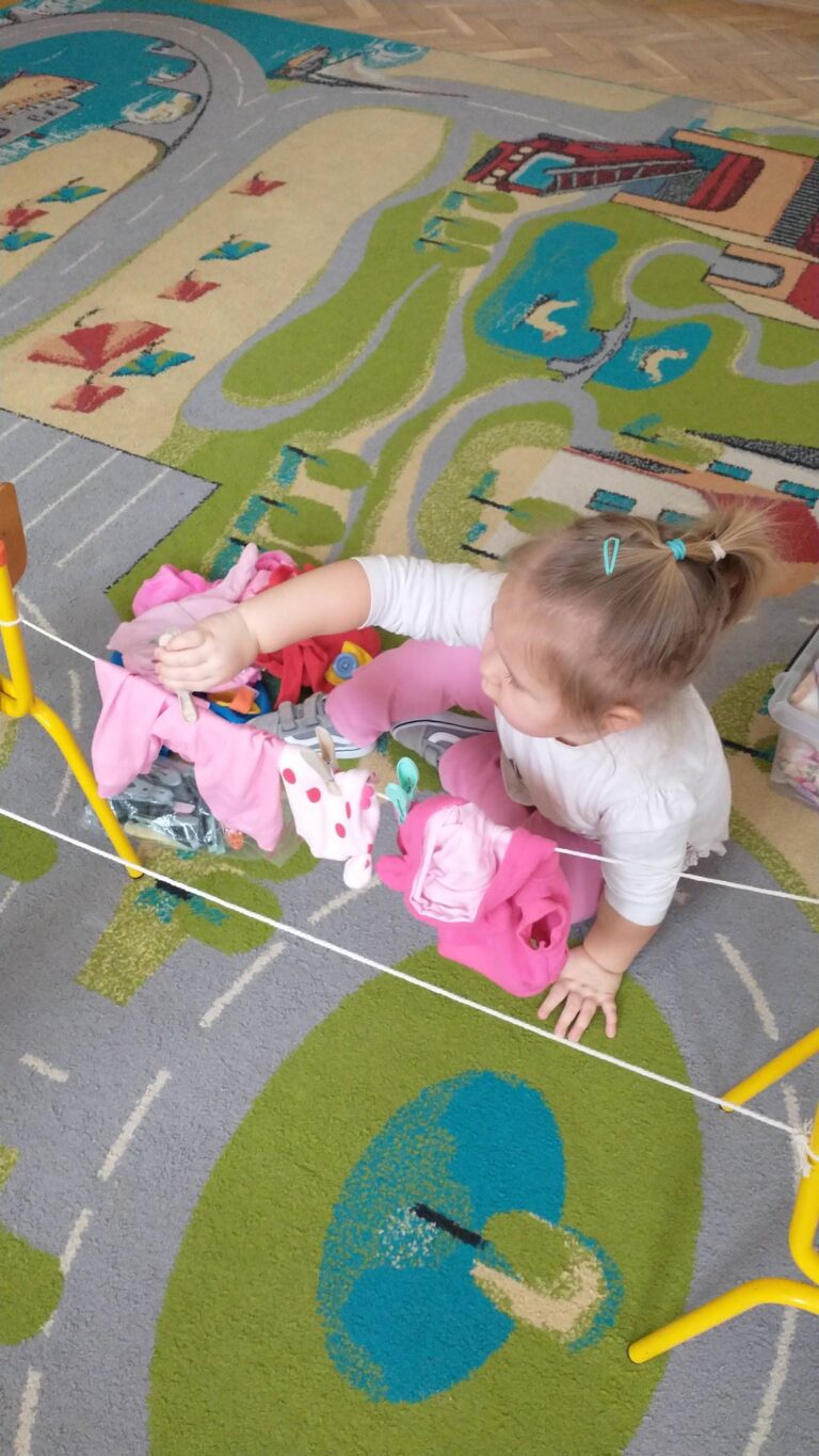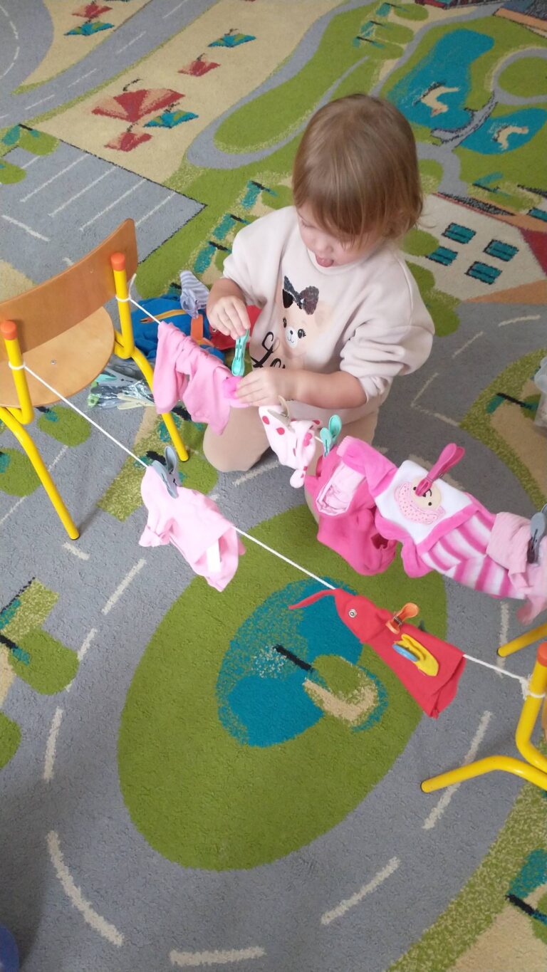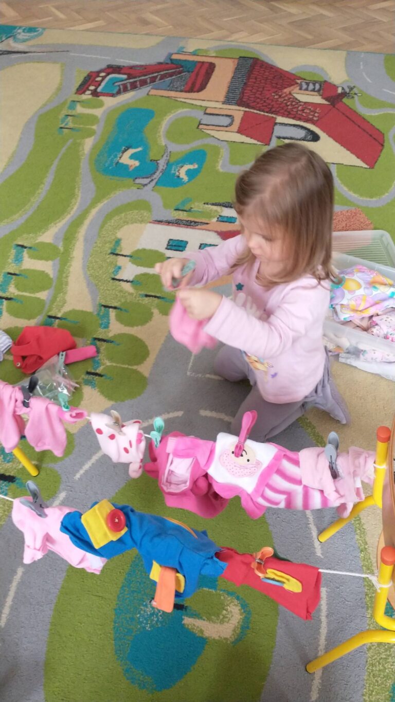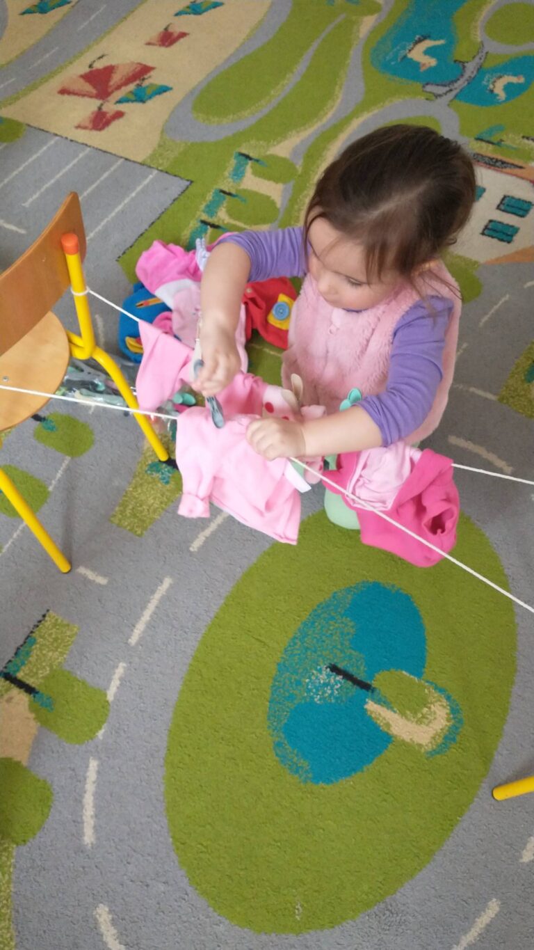 Zaczepianie ubranek na sznurek „Ćwiczymy sprawne paluszki – wieszanie ubranek na sznureczku.” „Zabawa w dom i codzienne czynności – uczymy się samodzielności.” „Małe zadania, wielkie postępy – rozwijamy koordynację ręka–oko.”