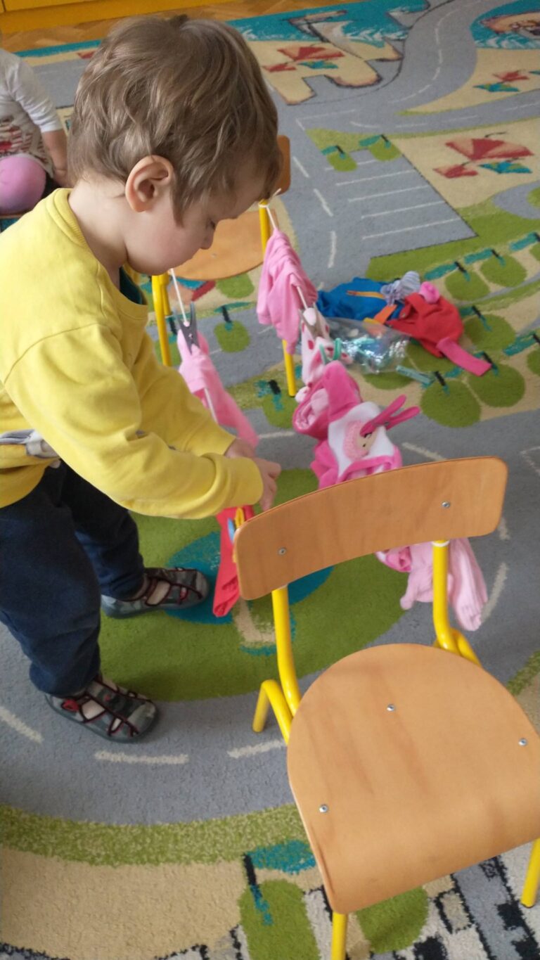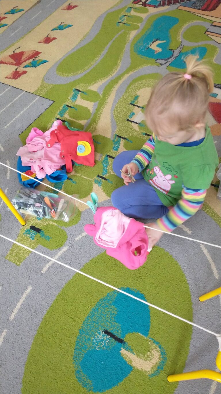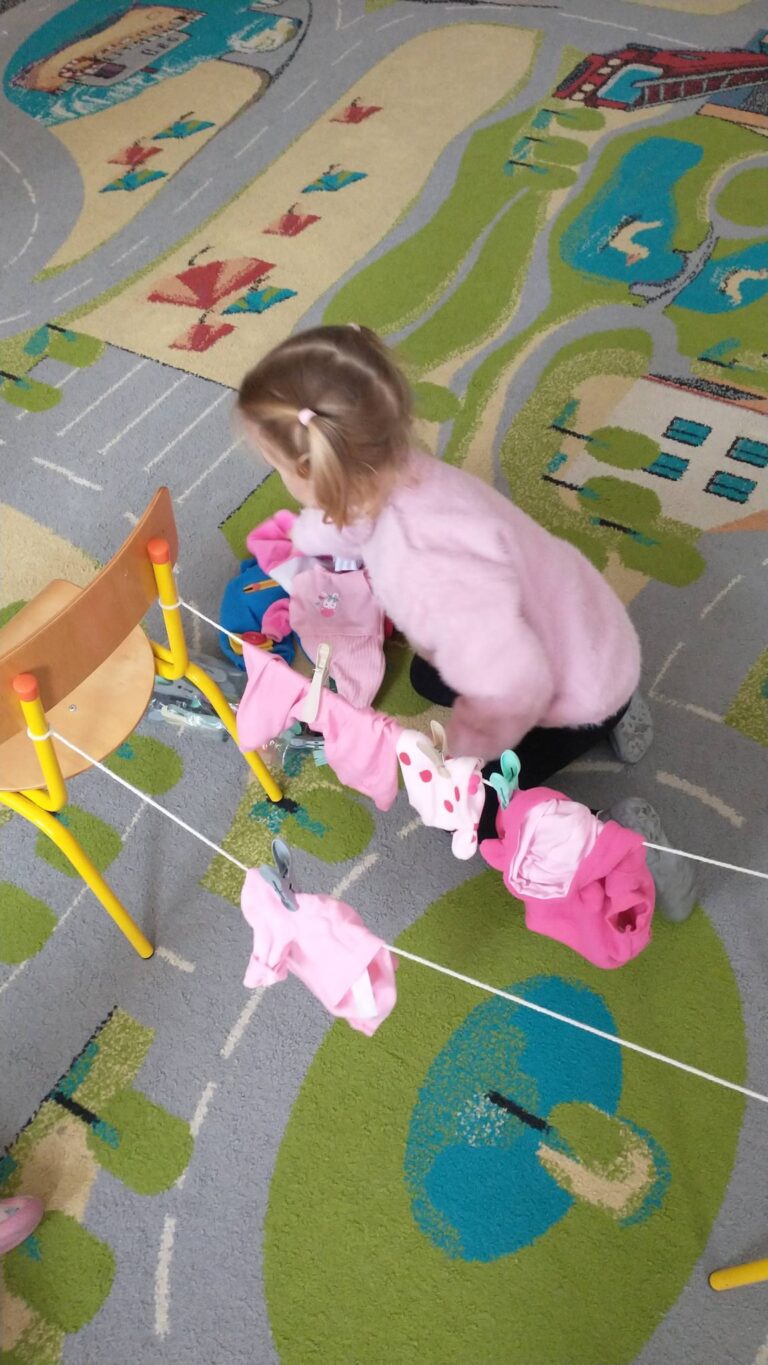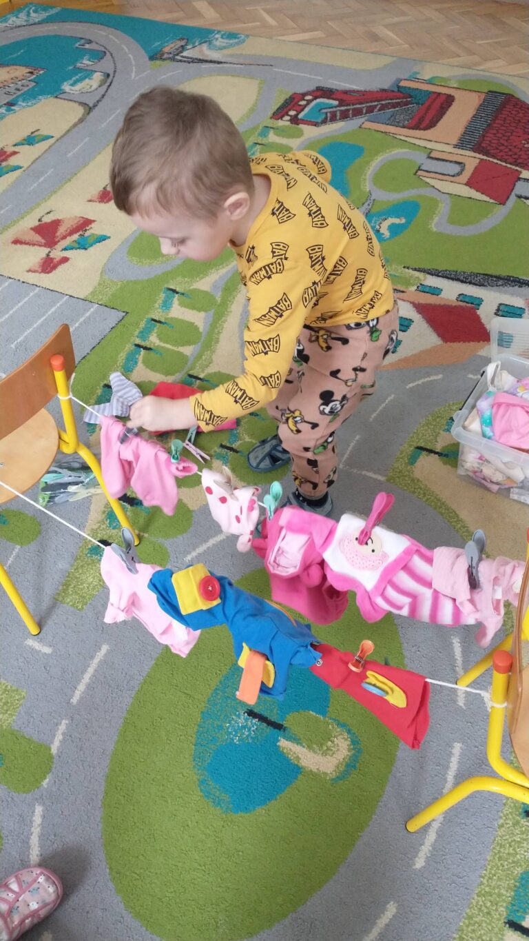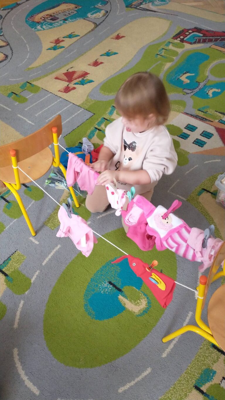 Zaczepianie ubranek na sznurek „Ćwiczymy sprawne paluszki – wieszanie ubranek na sznureczku.” „Zabawa w dom i codzienne czynności – uczymy się samodzielności.” „Małe zadania, wielkie postępy – rozwijamy koordynację ręka–oko.”
