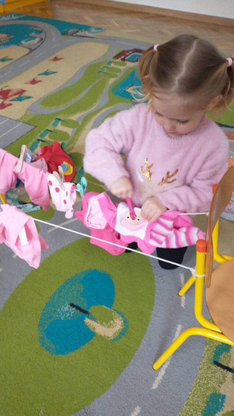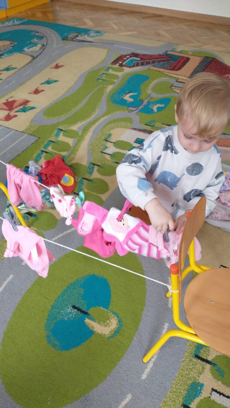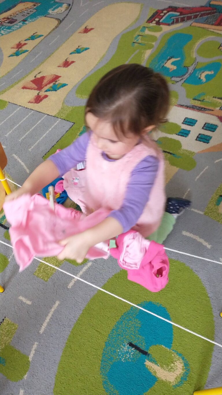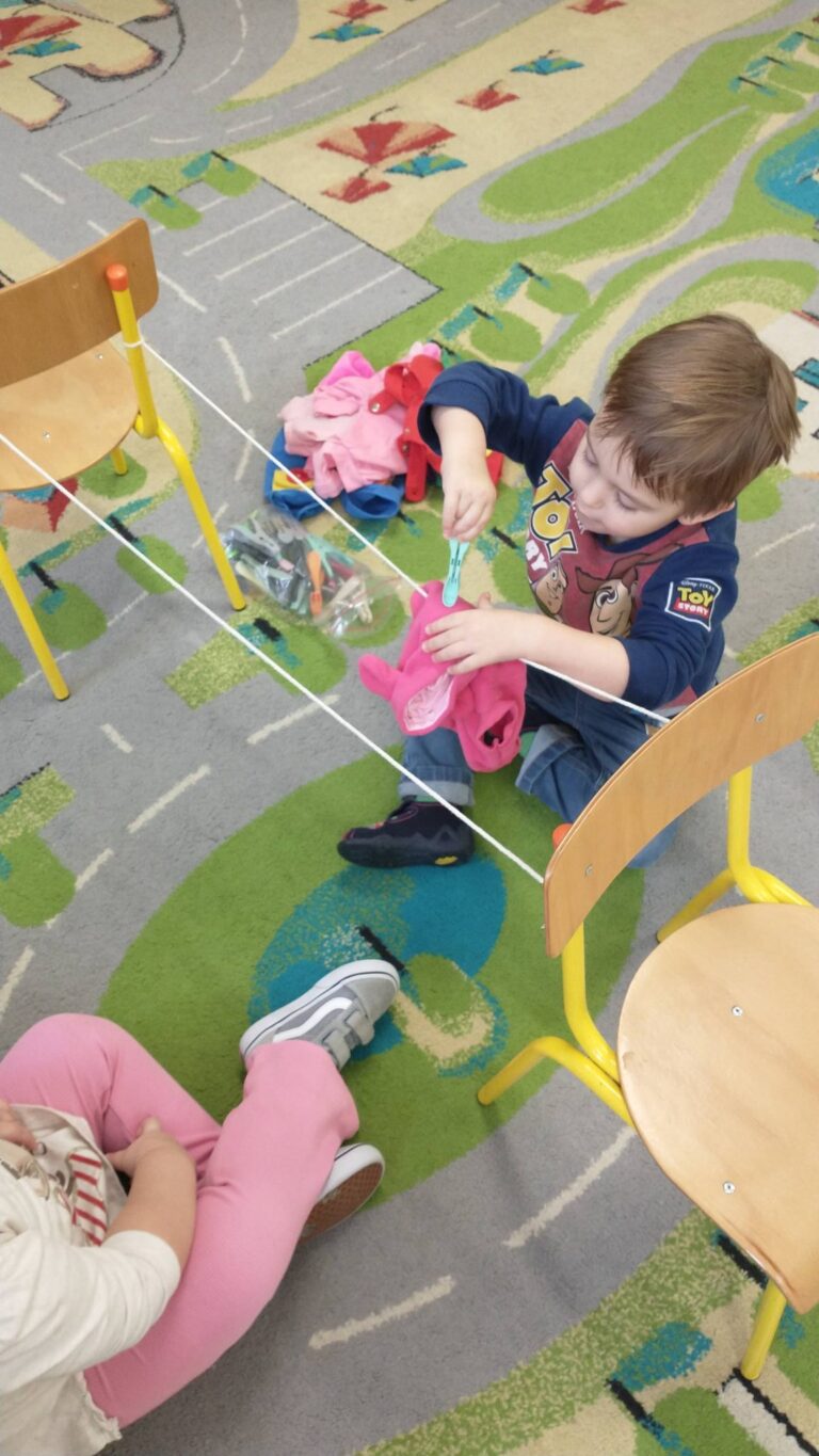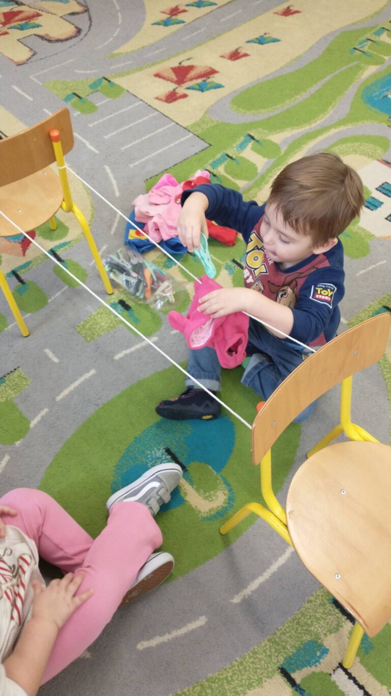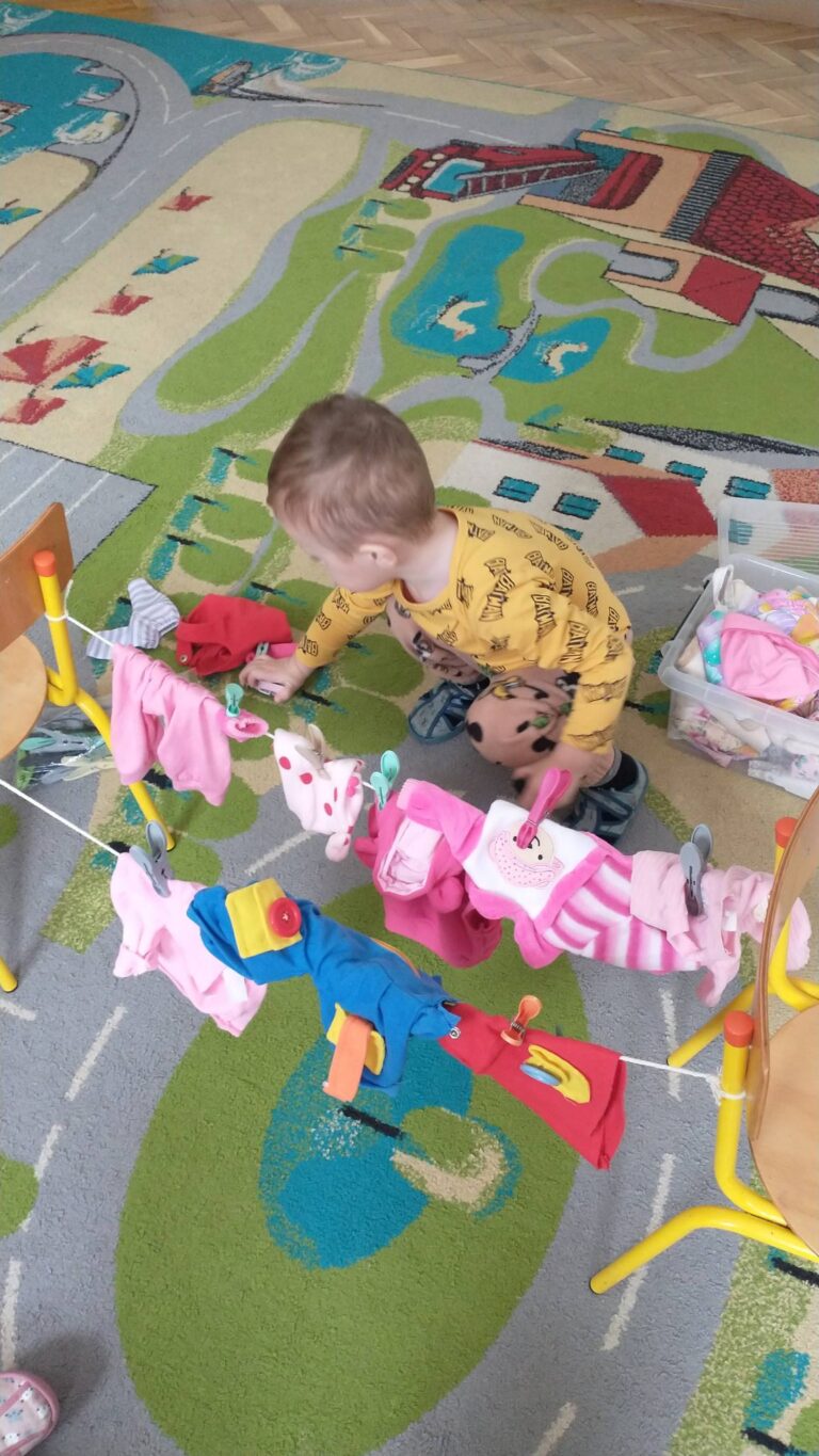 Zaczepianie ubranek na sznurek „Ćwiczymy sprawne paluszki – wieszanie ubranek na sznureczku.” „Zabawa w dom i codzienne czynności – uczymy się samodzielności.” „Małe zadania, wielkie postępy – rozwijamy koordynację ręka–oko.”