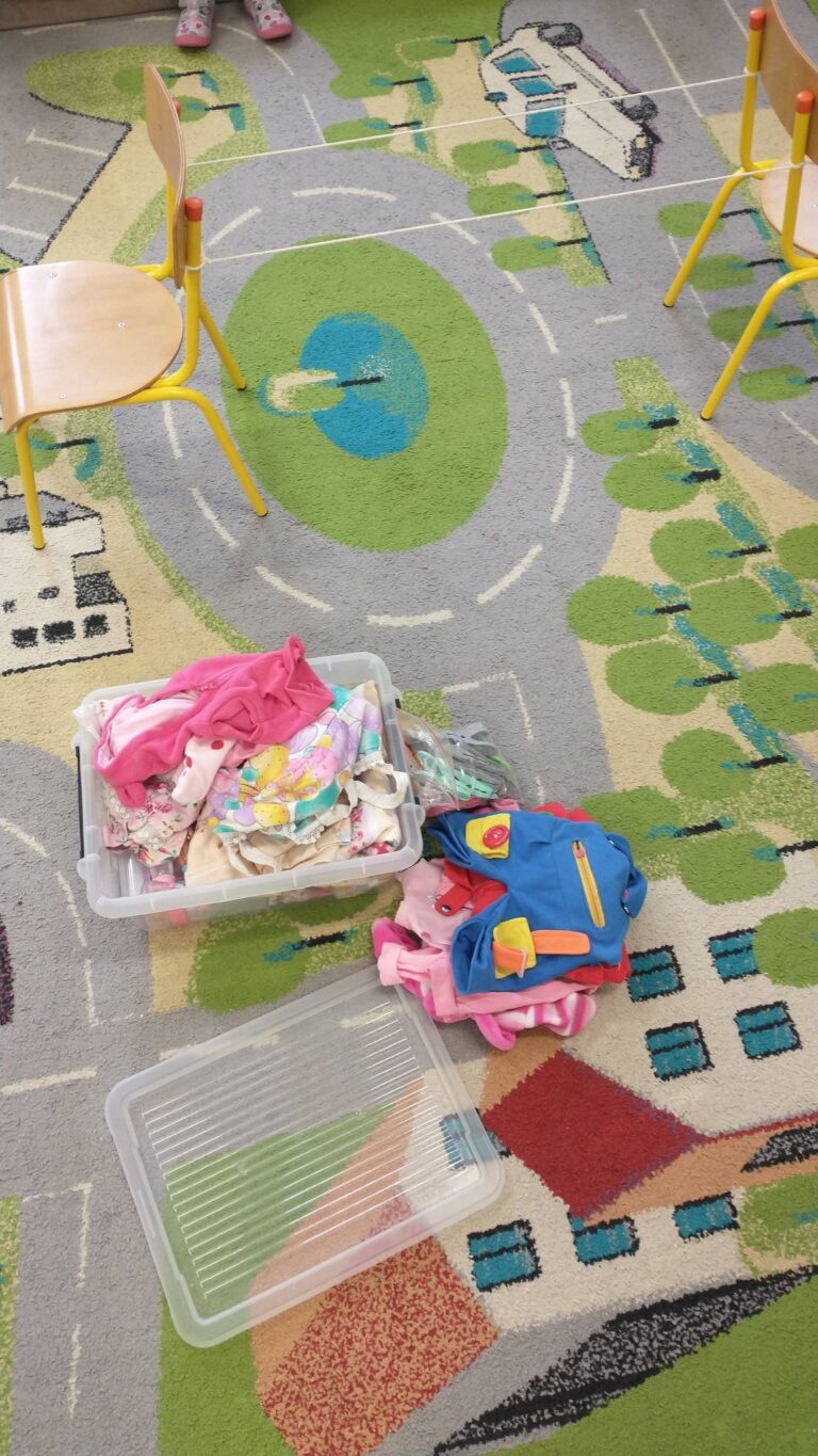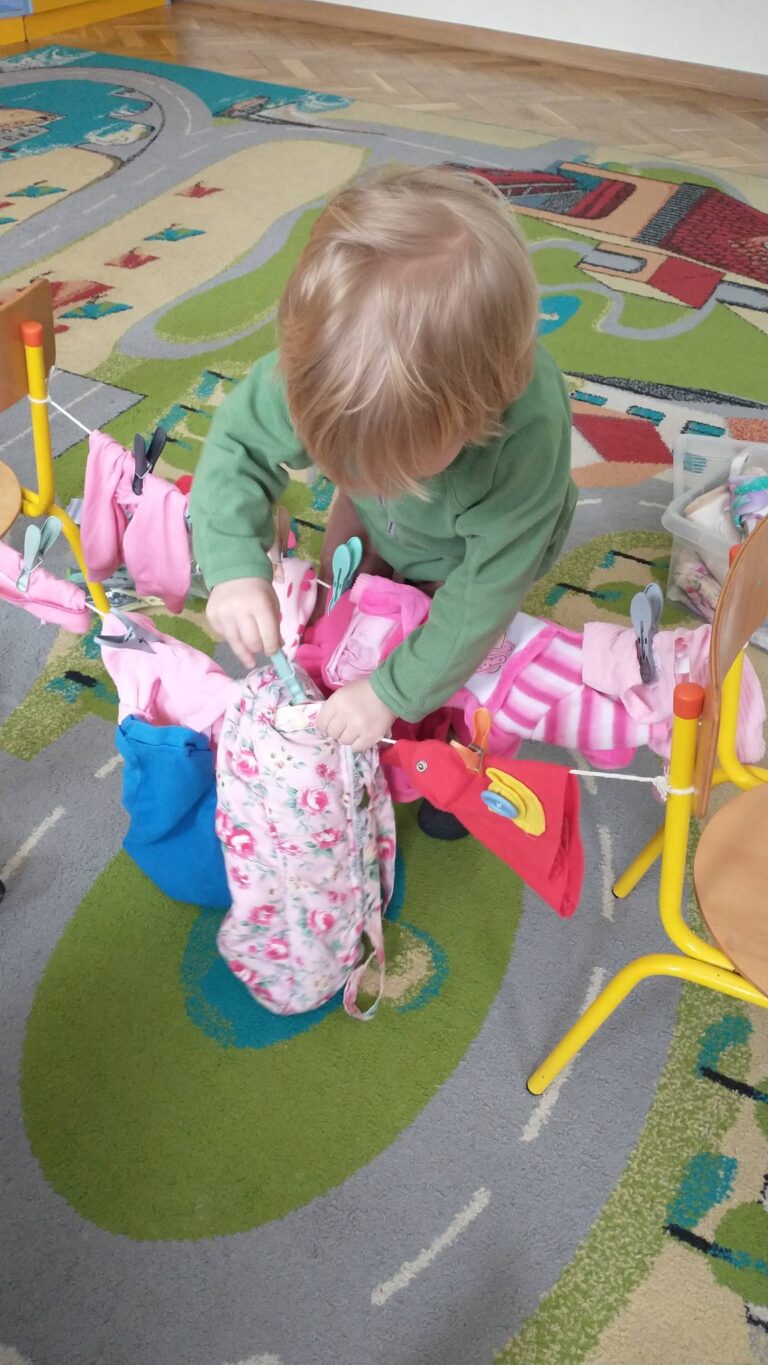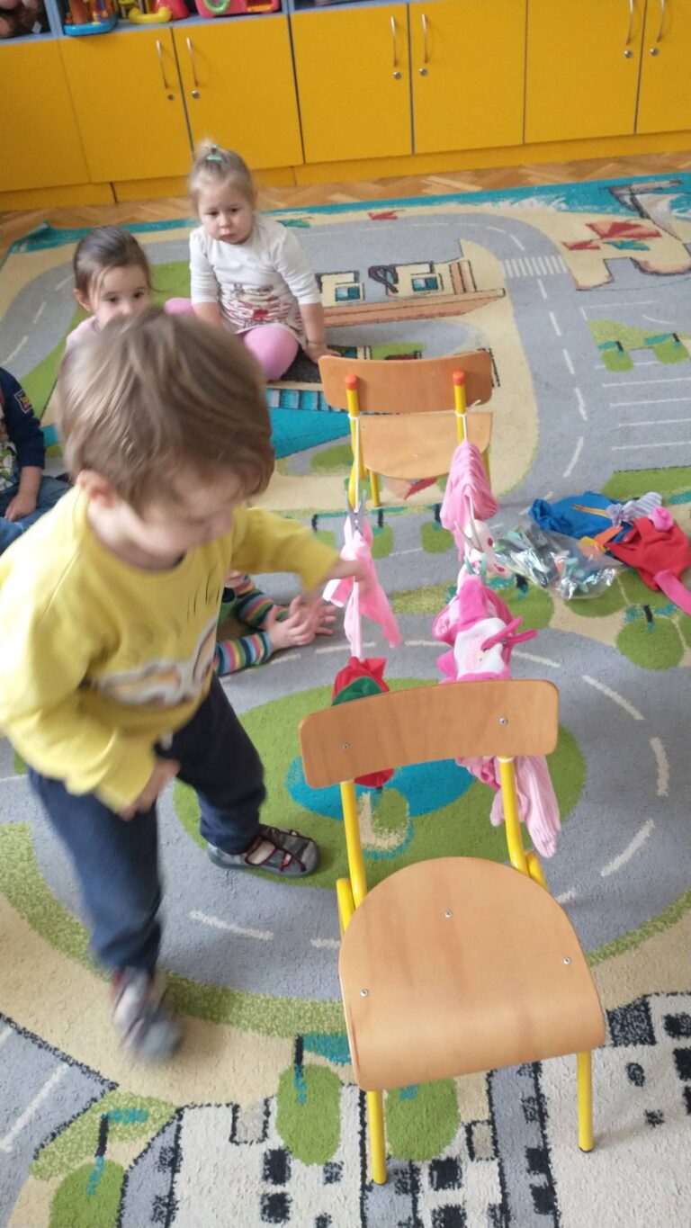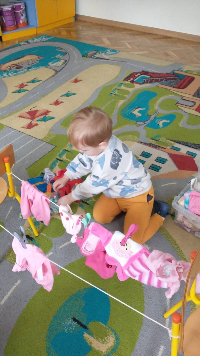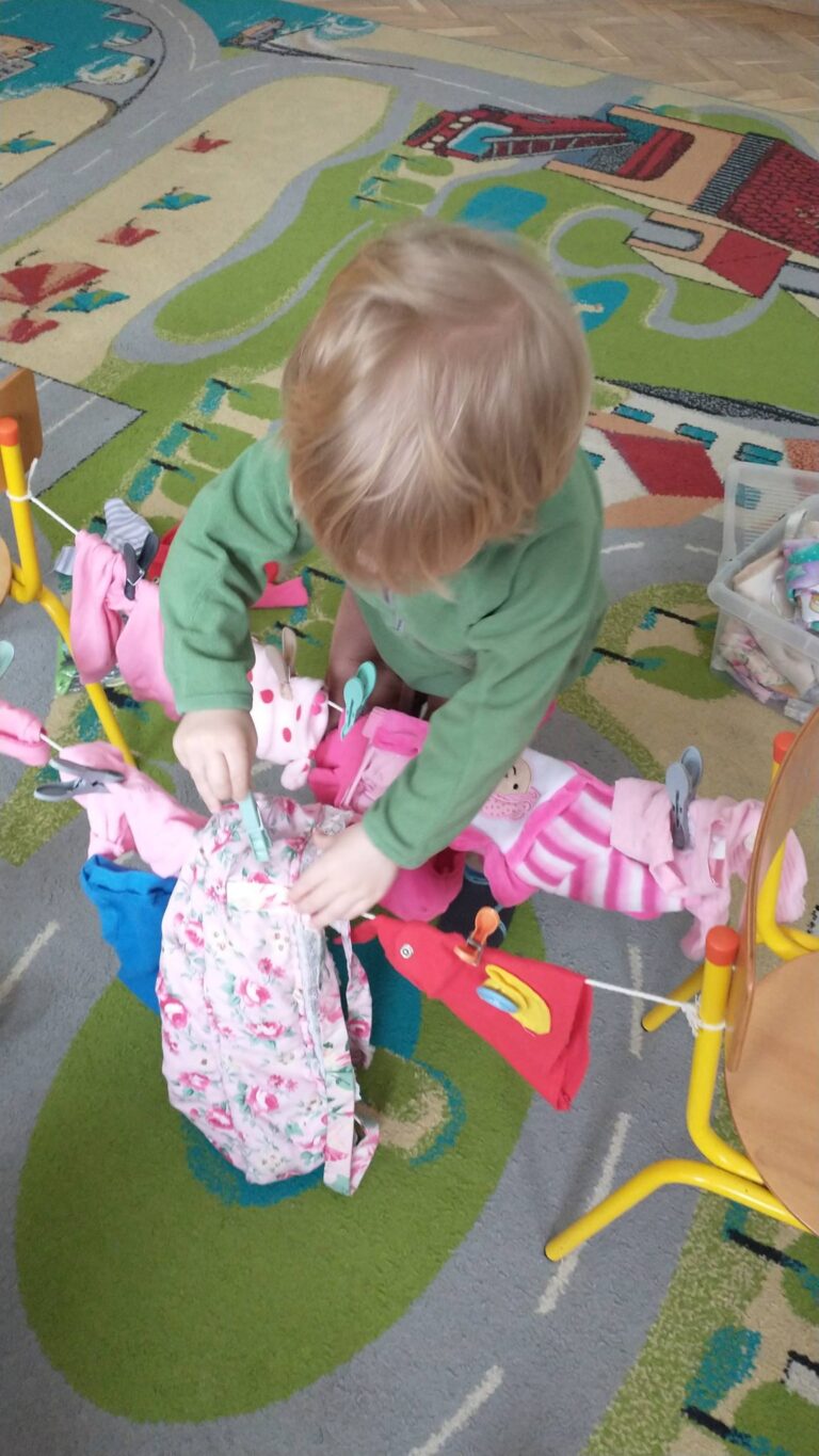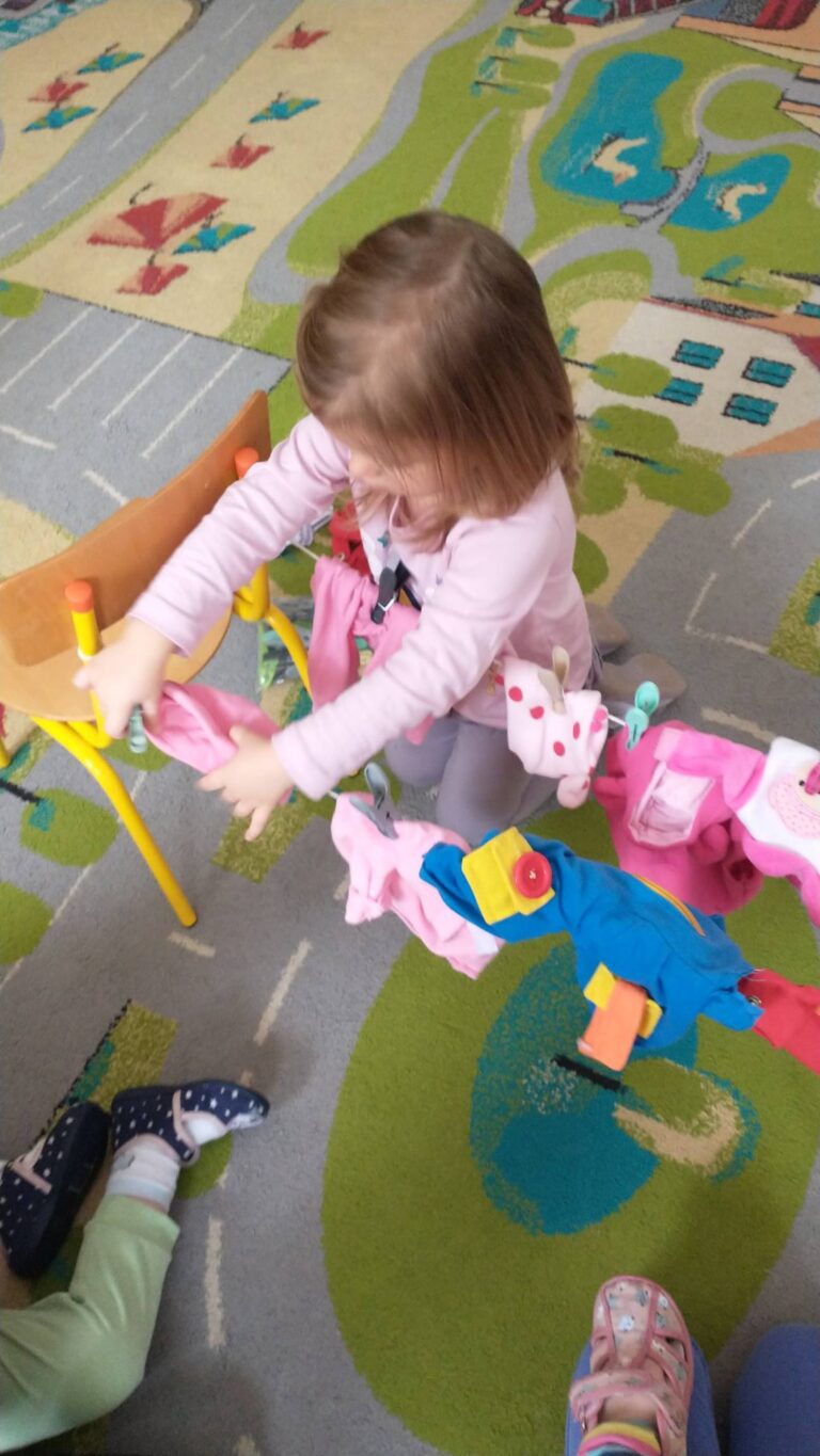 Zaczepianie ubranek na sznurek „Ćwiczymy sprawne paluszki – wieszanie ubranek na sznureczku.” „Zabawa w dom i codzienne czynności – uczymy się samodzielności.” „Małe zadania, wielkie postępy – rozwijamy koordynację ręka–oko.”
